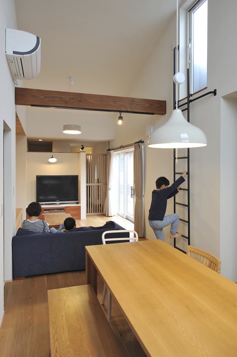 特に子世帯は、景色の良い西側に大きな開口を設け、天井をリビングからダイニングにかけてメガホン状に高くして外に向かって広がる空間を演出しつつ、中庭に面したリビングの壁は大きくアルコーブ(壁面の一部をくぼませてつくった空間)をしつらえ、落ち着ける空間になるように工夫しています。アルコーブはソファーとして子どもたちの格好の遊び場になっており、下部はキャスター付きの収納になっているのでおもちゃなどもすぐに片付きます。