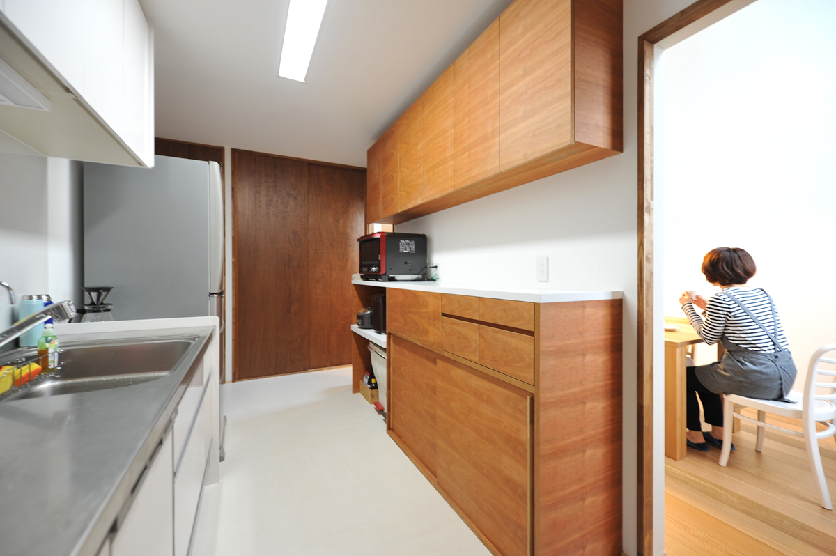 ダイニング生活感を出したくないとのことであえて分離させたキッチン。収納も食料庫も充実。