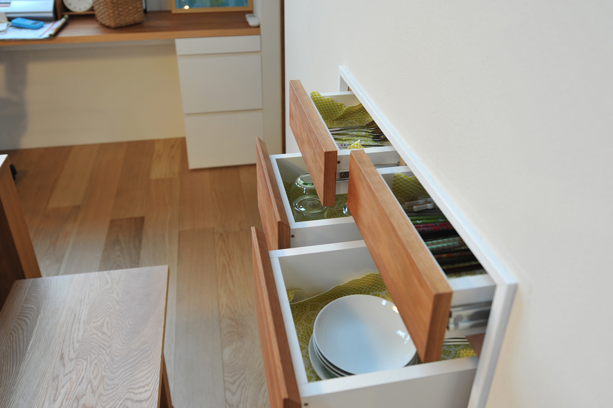 キッチンの真後ろ、ダイニング側にカラトリーなど小物をしまえる引き出しを仕込んでいます。