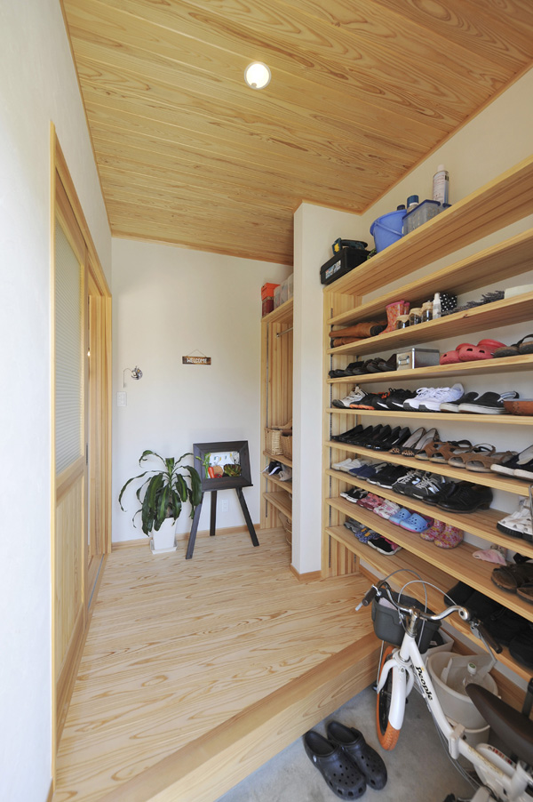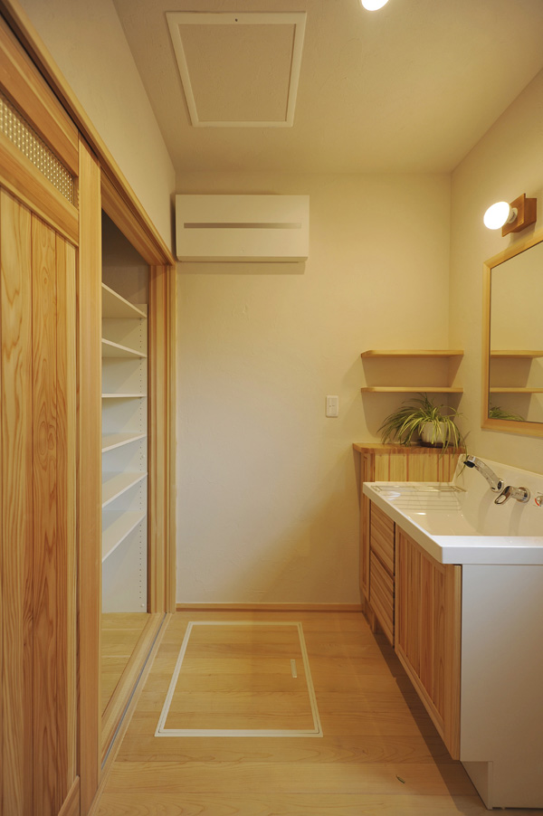 「杉の床材は足裏がサラサラで気持ちがいいです。外から家に帰ってきた時に梅雨時でももわっとしないし、木のいい香りがしてホッとします。」と奥様。
