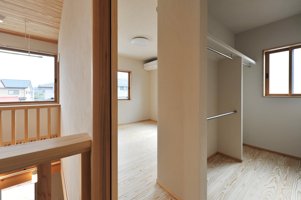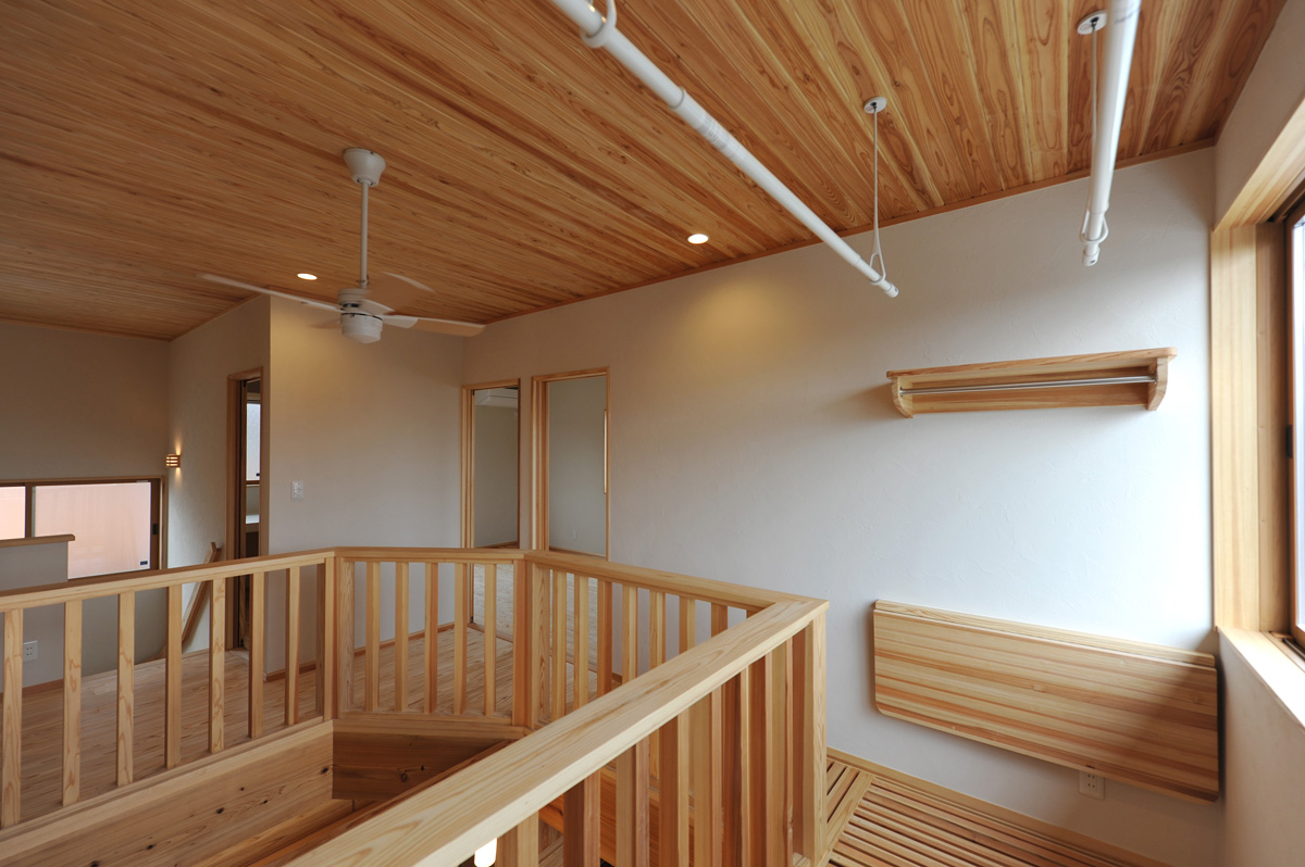 D7H_4163吹き抜けを中心にぐるっと回遊できる2階。D7H_4173吹き抜けの窓際に洗濯物干しスペース。簡単な家事ができるように折りたたみ式のテーブルも。D7H_4161吹き抜け横に主寝室。大きなウォークインクローゼット付きで干したものをそのまま仕舞えます。D7H_5126まだ仕切っていない子供部屋はフリースペースとして。D7H_4159手洗い収納も造作。ここも消臭効果も高いゼオライト塗り壁。D7H_5150
