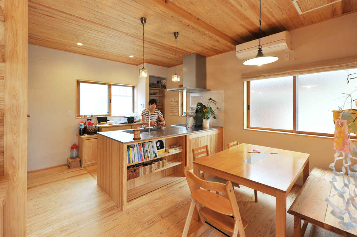 ①室内で目に入るところはほぼ「木」と「自然素材」という、まちなかログハウスのような内装は、床、杉、天井、建具も杉。ゼオライトという吸放出性に優れた塗り壁材を使用。