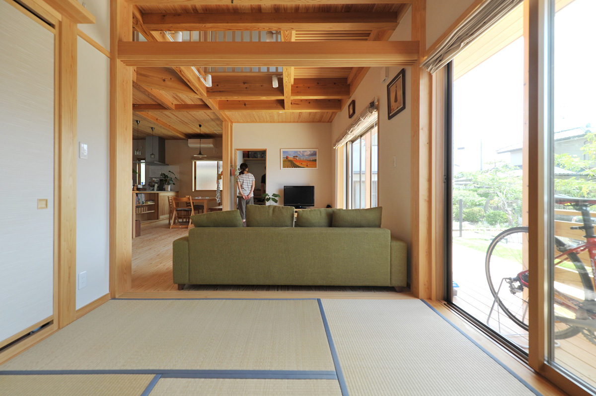 ②LDK+和室を大きなワンルームとして繋ぎ、リビング上部に吹き抜けを設け、さらに掃き出し窓はフルオープンが可能なものを採用し、抜群の開放感を実現。