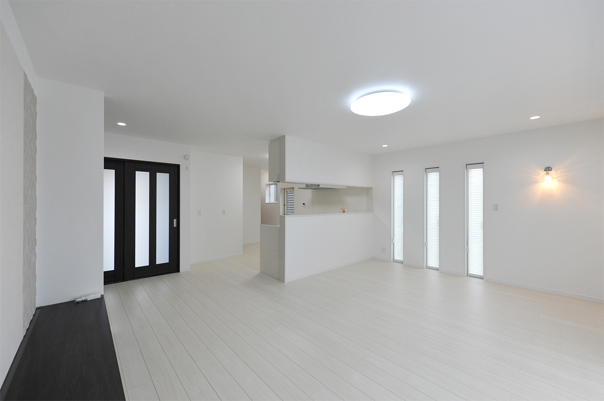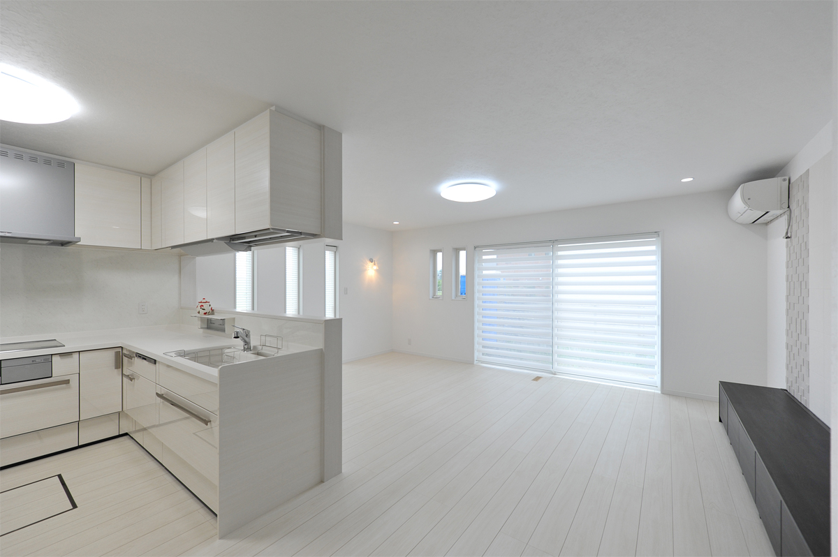 LDKは愛犬の毛色と合わせて白が基調、ハイパーフロア+ワンというペット用フローリング。カーテンも白のみでスッキリ。北側玄関なので明るいイメージにしたかったとのこと。