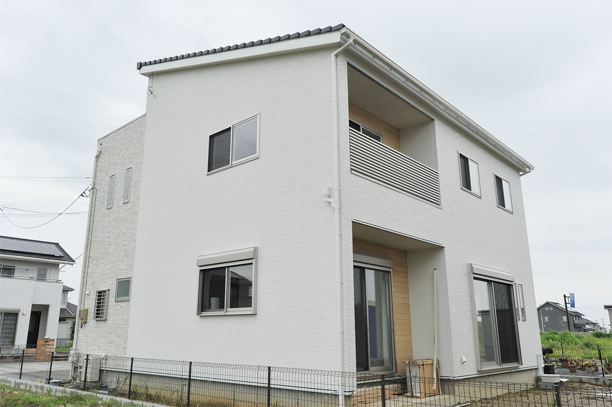 セットバックを用いたモダンな印象。一階窓はシャッター付きで防犯上も安心。
