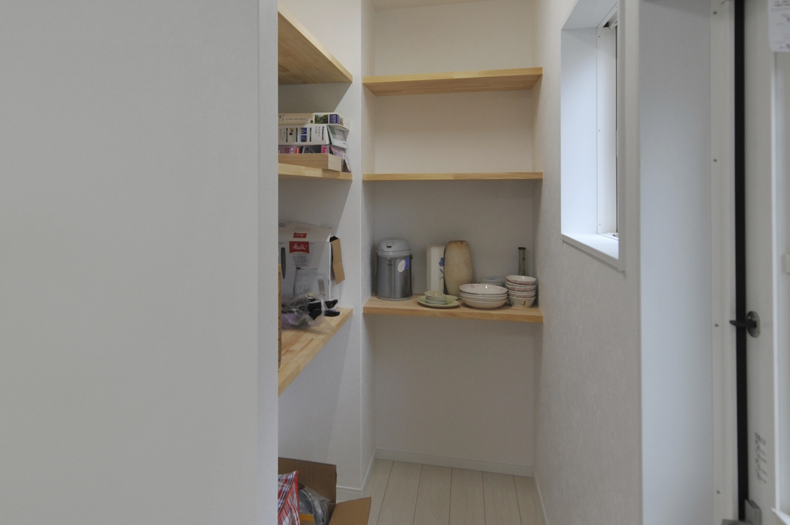 キッチン後ろには角スペースを活かしたパントリー。