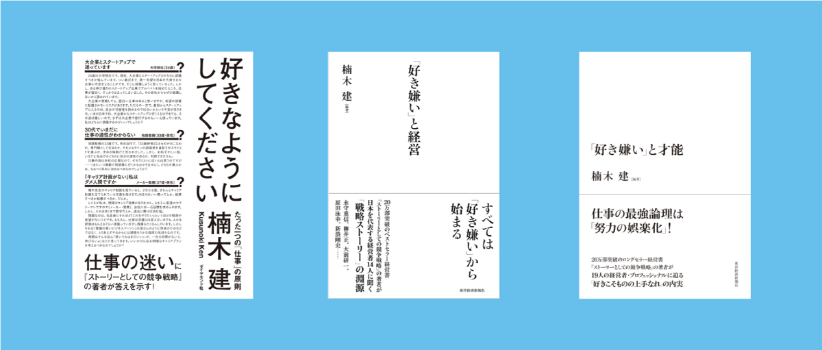 スキスキ3部作と呼ばれている、一橋大学教授の楠木建さんの著作があります。本屋さんのビジネス書のあたりにあります。仕事は良し悪しで評価し、自分の好き嫌いで判断してはいけないということに、疑問を投げかけ、本当にそうでしょうか?好き嫌い、自分の好きなことを趣味にとどめるのではなく、仕事にしていくことがよりよい仕事の原動力やアウトプットになるのではないでしょうか。ということを3部作で様々な切り口から書かれている本です。「好きこそものの上手なれ」ということわざで、仕事の質や仕事の仕方などを評価する視点がおもしろく、ついつい3冊読んでしまいました。