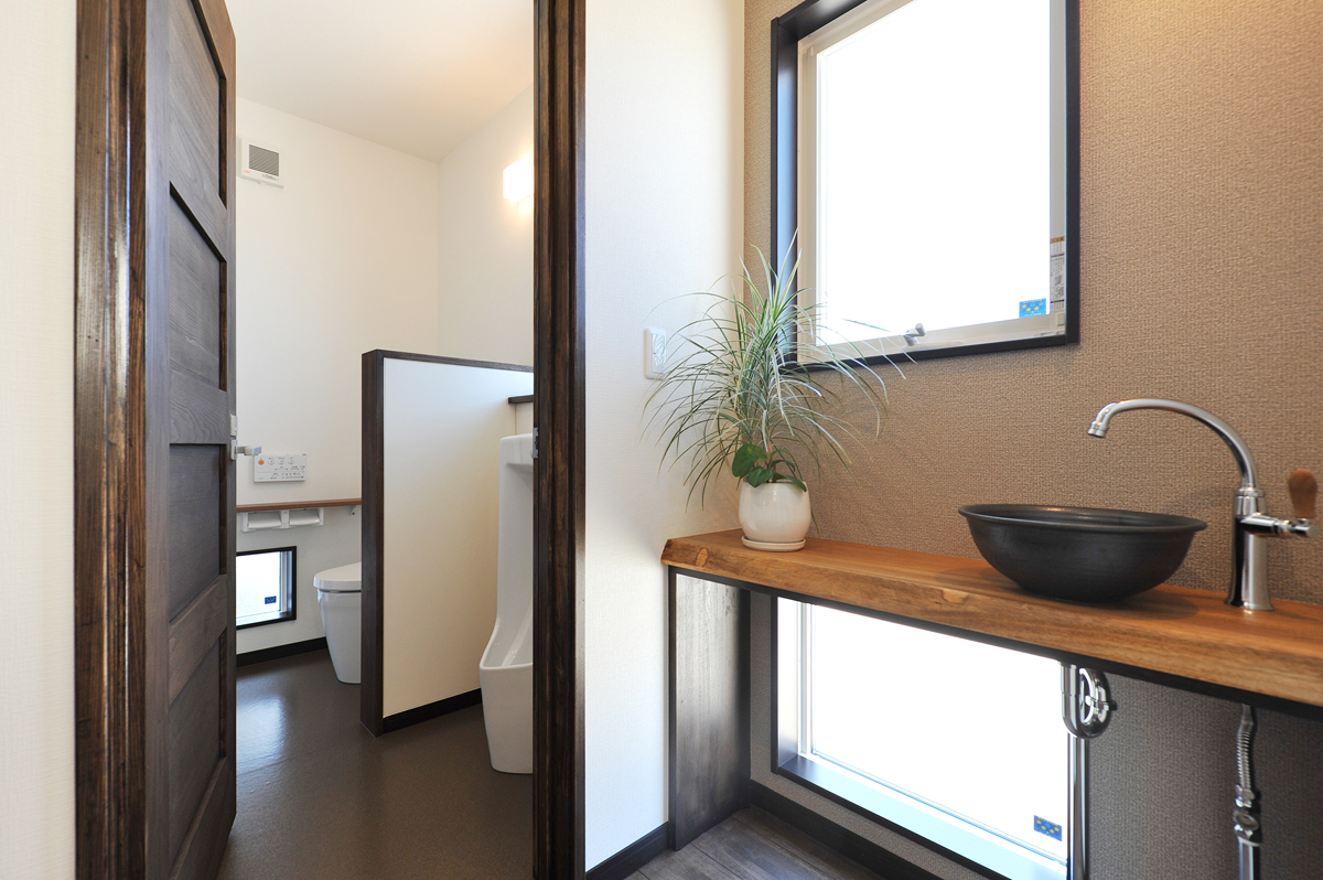 造り付けの手洗い、小便器、便座と余裕のあるトイレ周り。