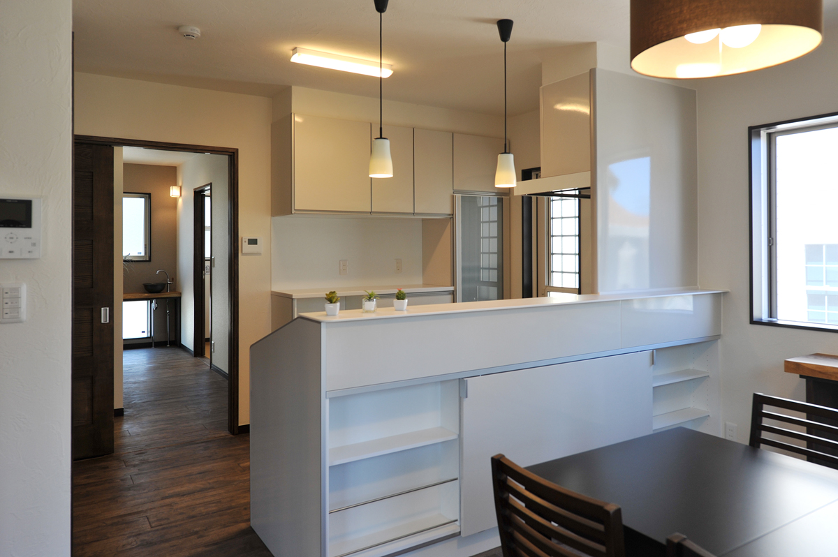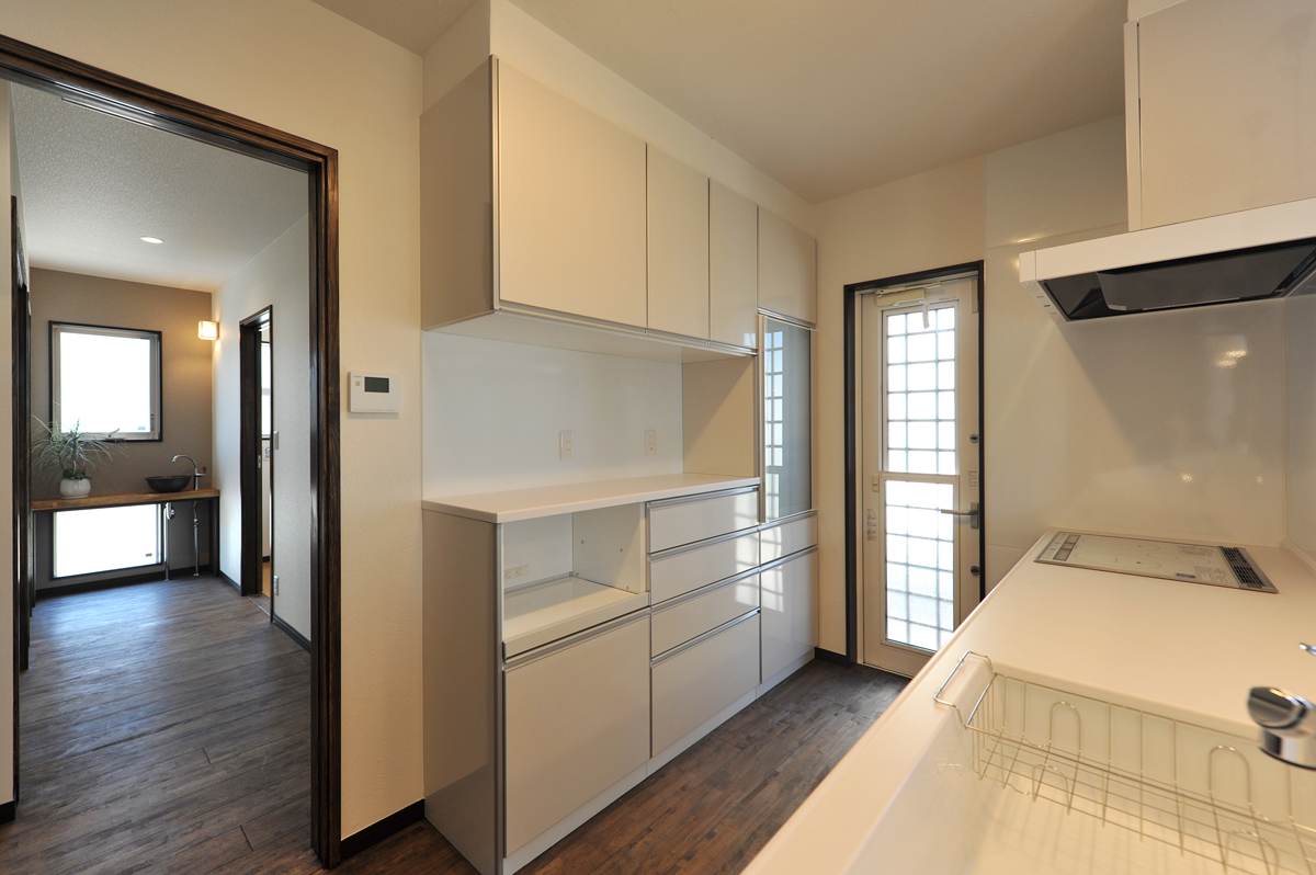キッチンの裏はサニタリー関係(トイレ、洗面脱衣、お風呂)がまとまっている使い勝手のよい動線。