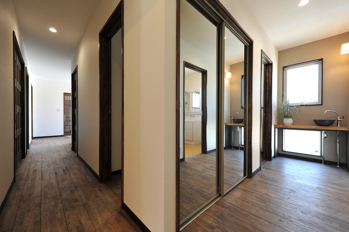 L字型の廊下も収納たっぷり。左手側のドアはほぼ全て収納。右手側の鏡のうらも収納。