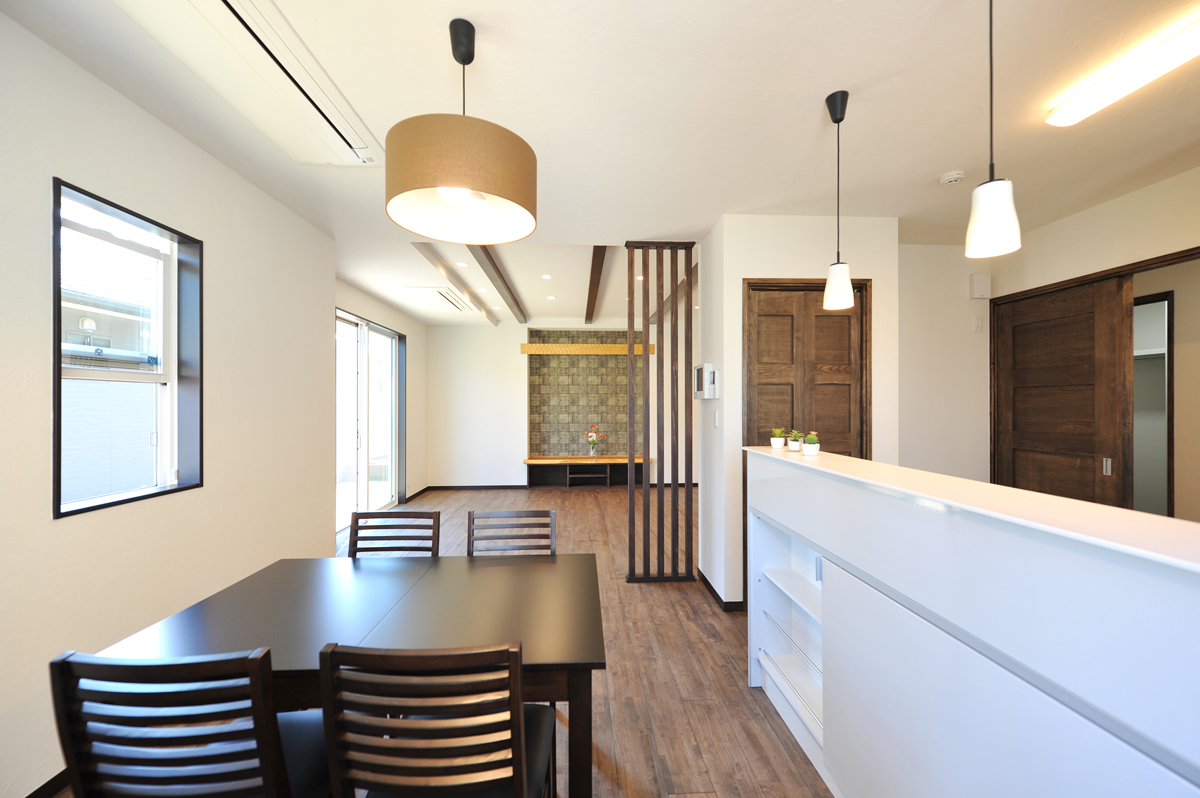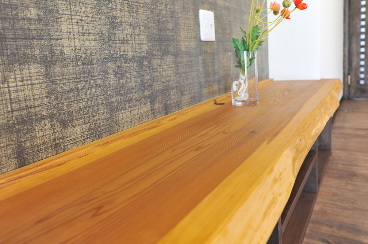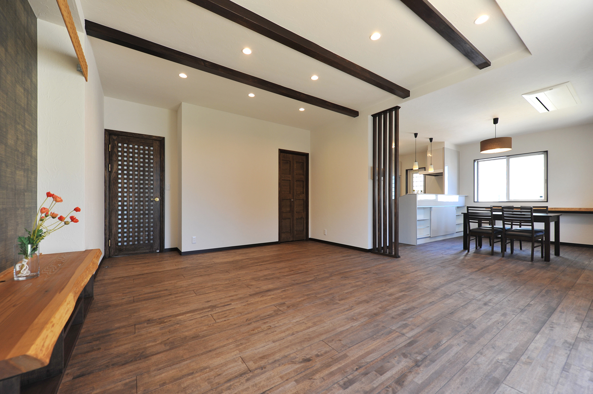ダークブラウンに塗装したラバーウッドを基調に、見せ梁と無垢の一枚板で和モダンを意識。