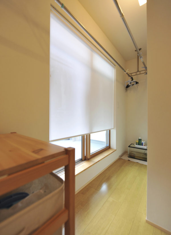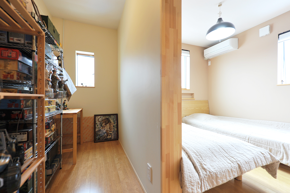 2階のベランダの手前に専用の室内洗濯物干し場を。便利に活用中。132階主寝室にはウォークインクローゼットに加え、アメリカ雑貨が好きなご主人の書斎スペース。