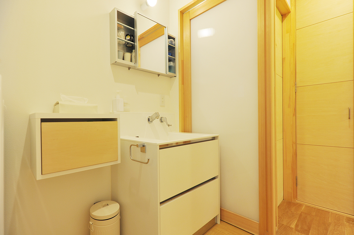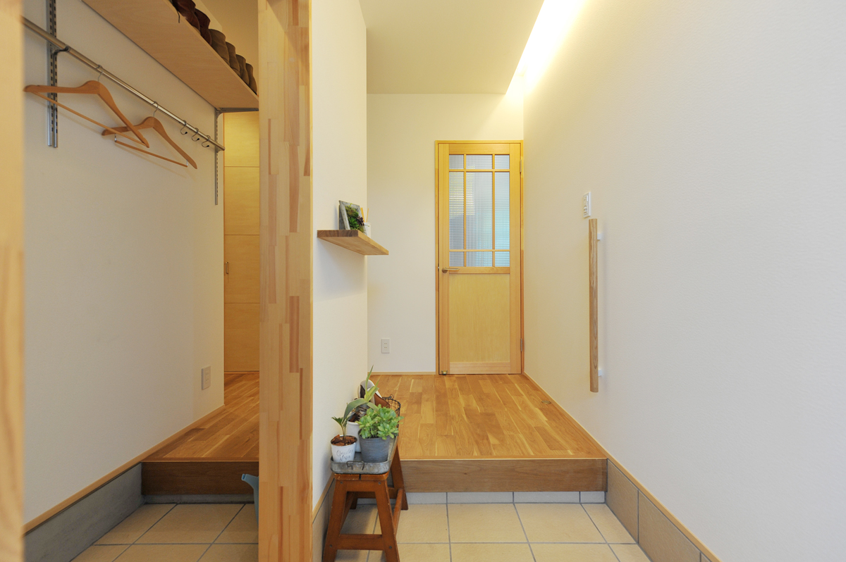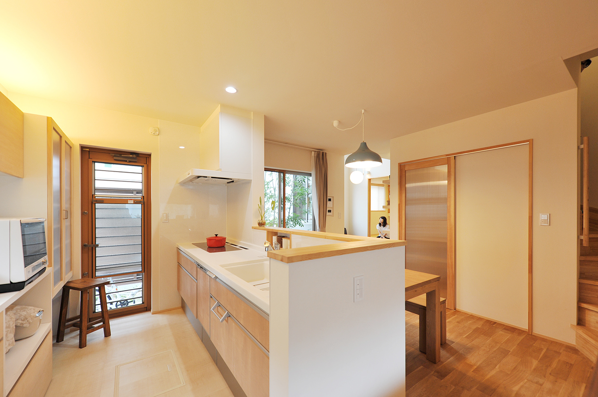 いつも物が出ていない整頓されたパブリックスペースと、プライベートを分けたい、という建主様の希望は「回遊動線」で叶えました。玄関を入るとリビングに続くドア(表動線)とキッチンへ直接行ける廊下(裏動線)と二通りの動線を作り、キッチンで2つの動線が繋がりぐるりと回遊できるようになっています。キッチンを中心に動線を分けつつ移動距離は極力少なく、で「想像以上に使いやすくてびっくりです。」と奥様。