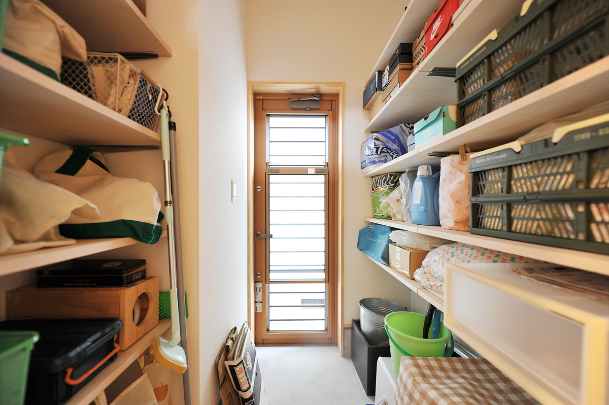 パントリースペースにも勝手口(キッチンにもあります)。床はコンクリート土間仕上げ。外の物も仕舞えます。