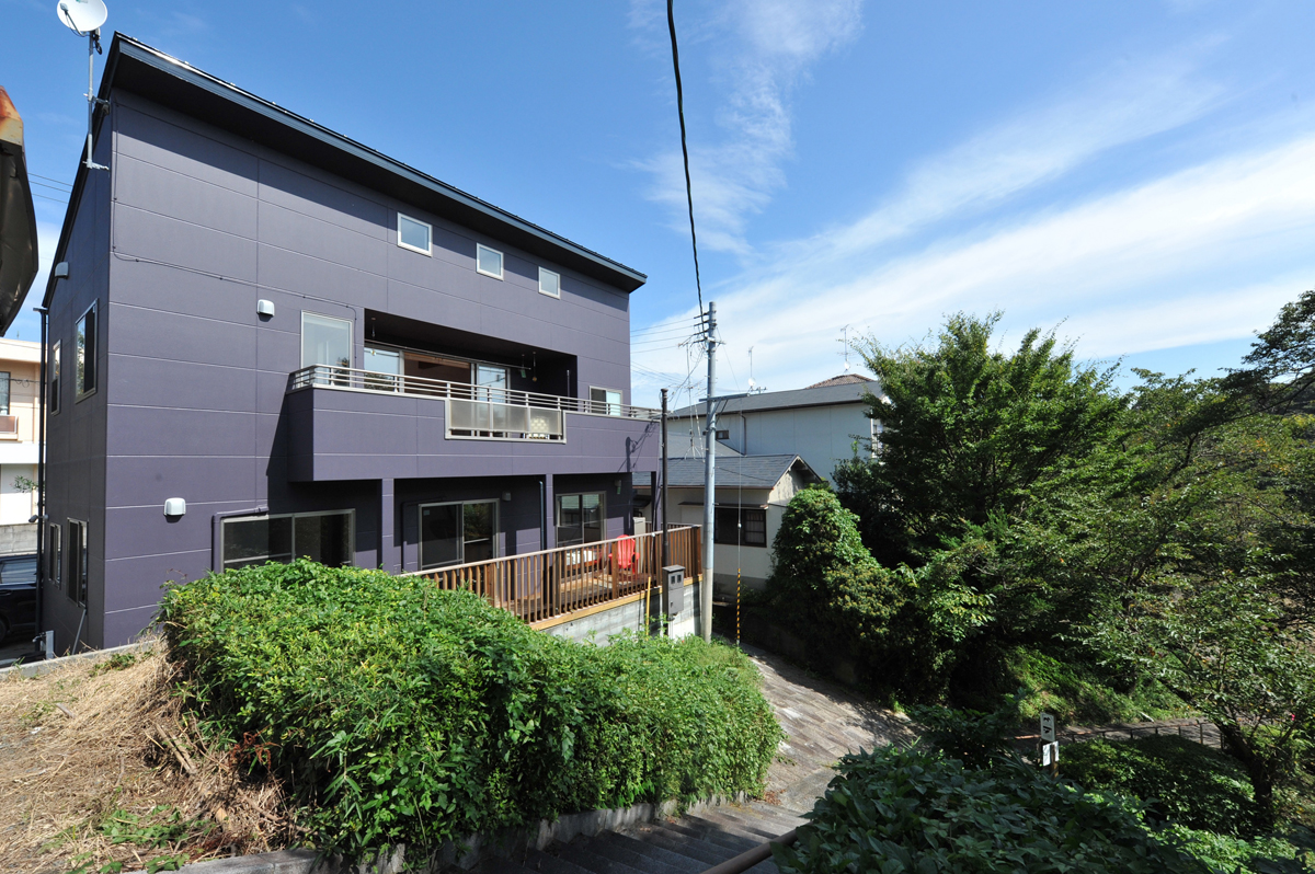 外壁はもともとは白でしたが建主様のこだわりのダークパープル色で塗装。深い緑と青い空とも好相性です。