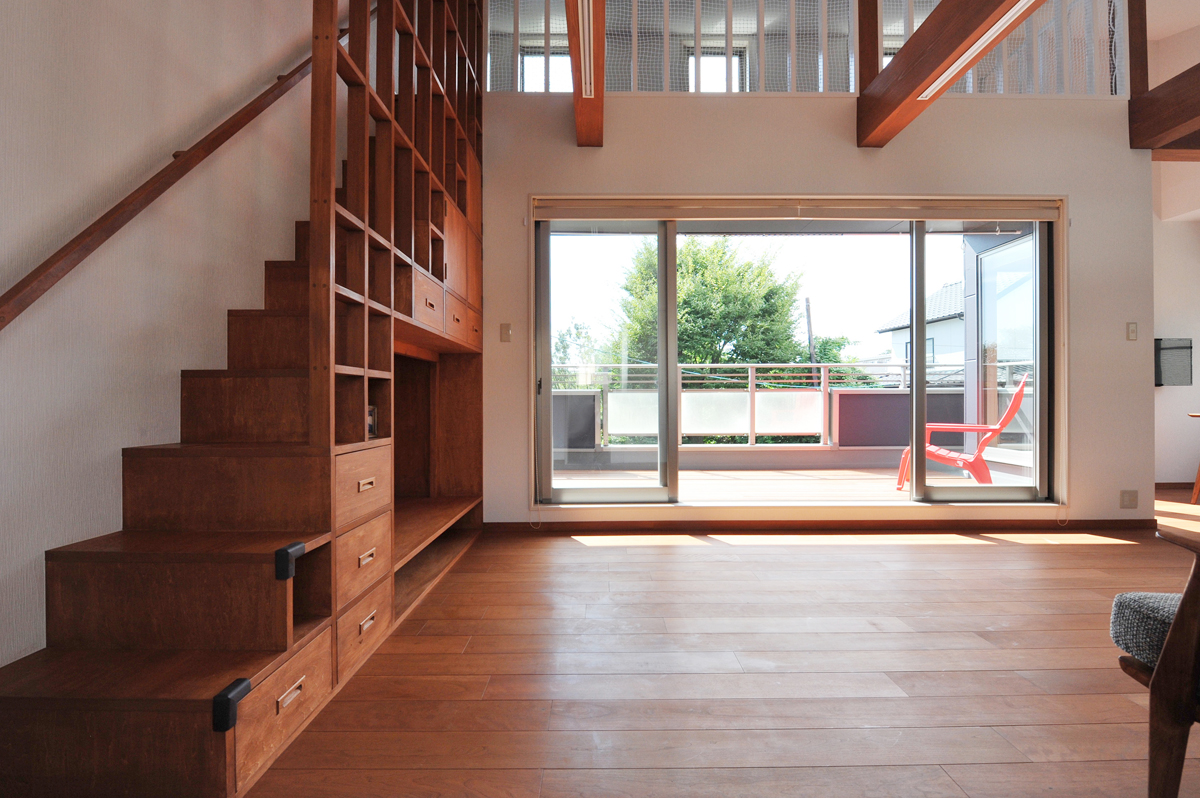 今まで物置と化していたリビング上のロフトに箱階段を組み合わせ、子どもたちが遊び回れる空間をつくりました。箱階段は収納とテレビ台を兼ねています。手摺と格子で小さなお子様の落下にも配慮。
