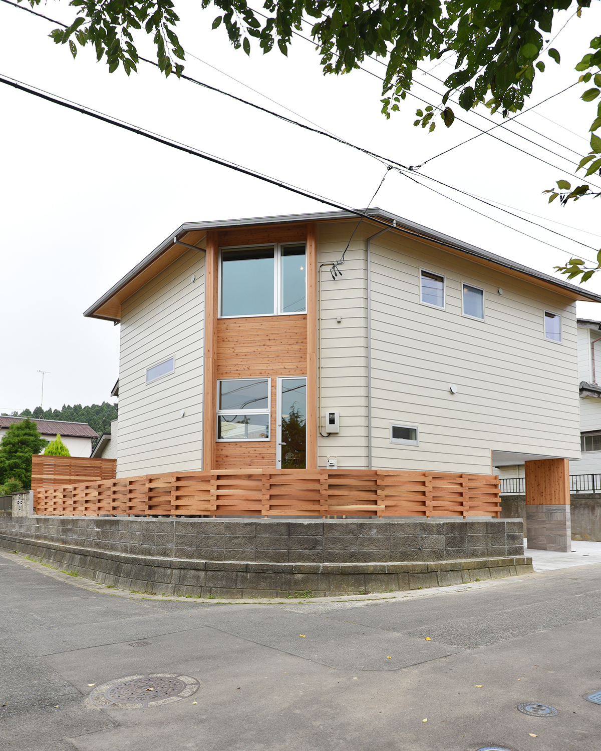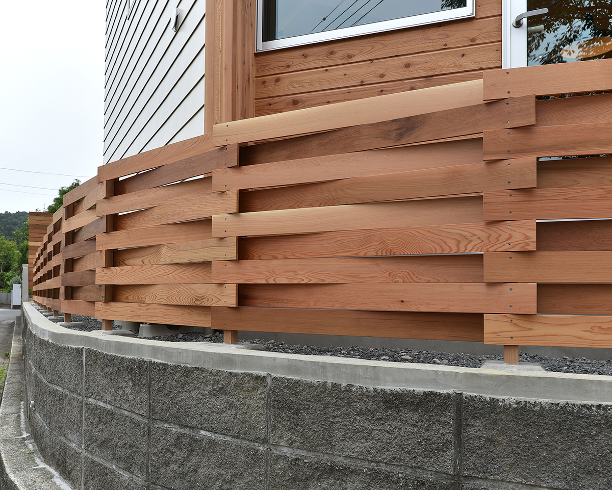 高低差があるため低めにデザインされた外塀。アールの敷地形状を活かすよう組み方を工夫している。