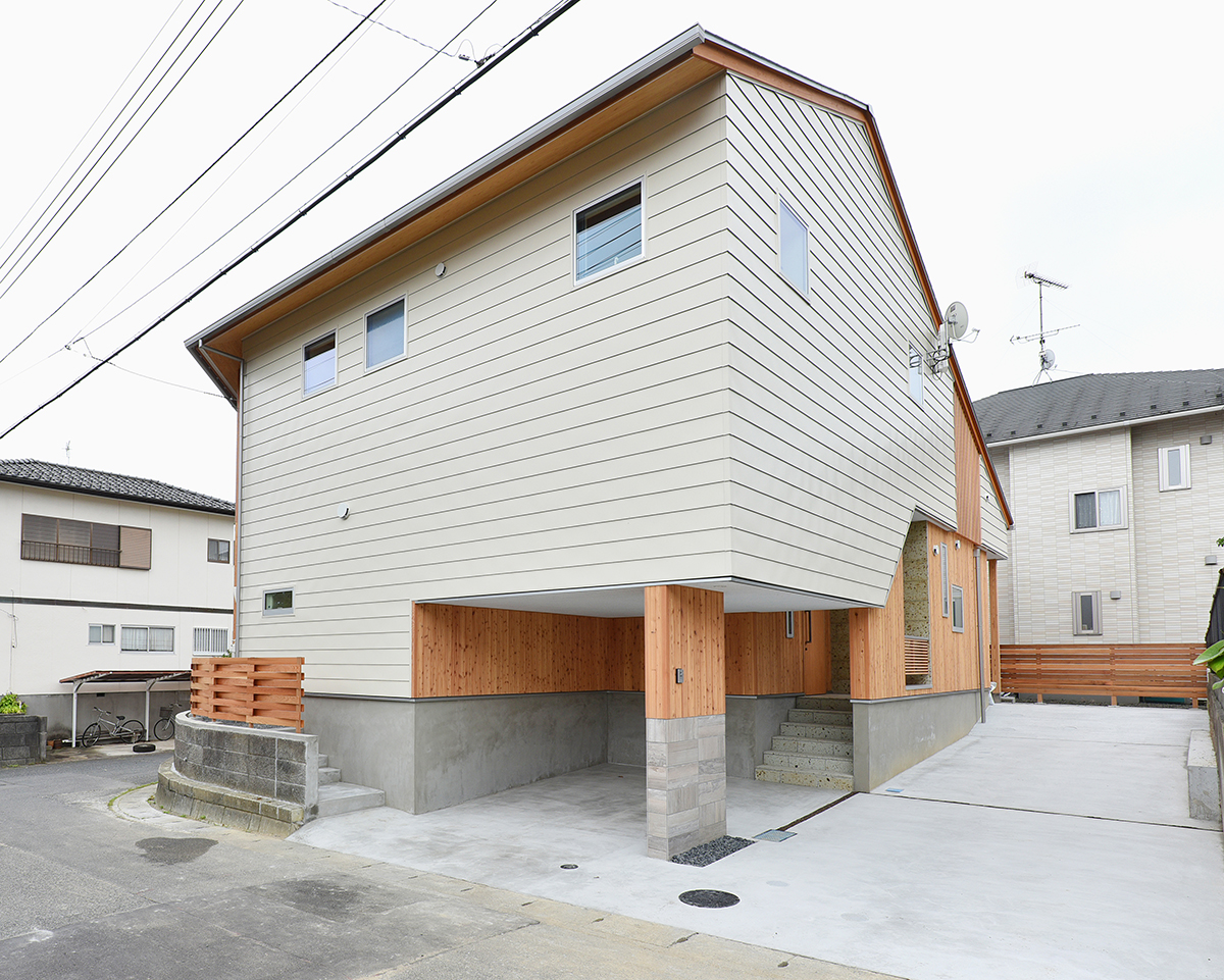 ①建物をL字型に配置することで隣家の目が気にならないプライベートな庭をつくり、日があまり当たらない南面の西側部分は平屋にして、天井高を高くしトップライトをとることで室内物干しスペースとした