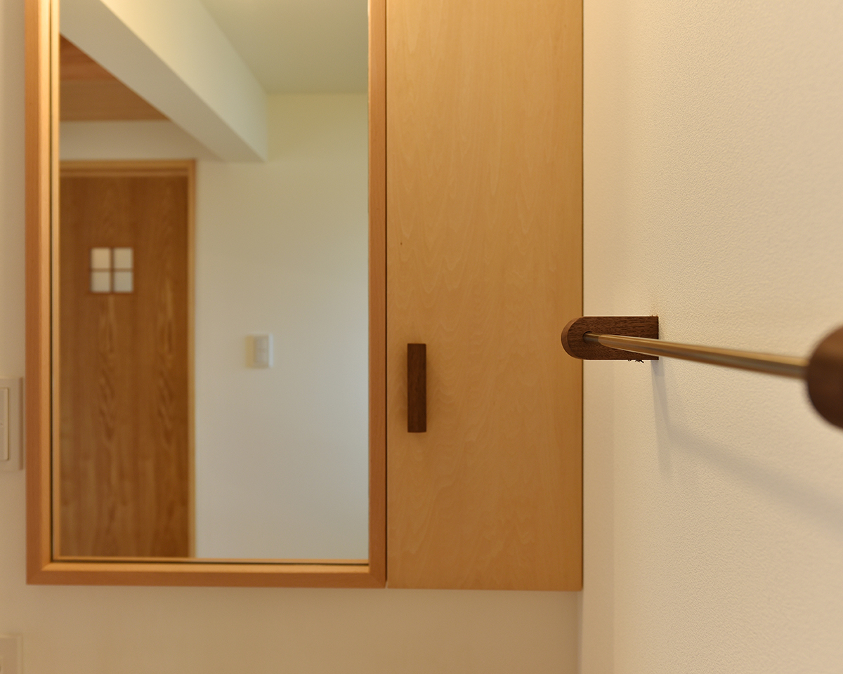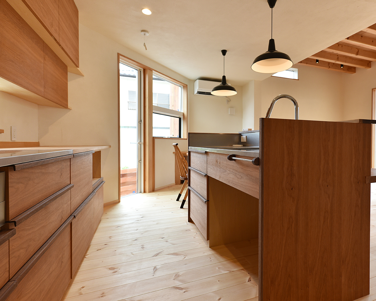 収納はほぼすべて造作。取っ手や枠にブナやウォールナットなど堅木を用い、シンプルに使い勝手よくデザイン。