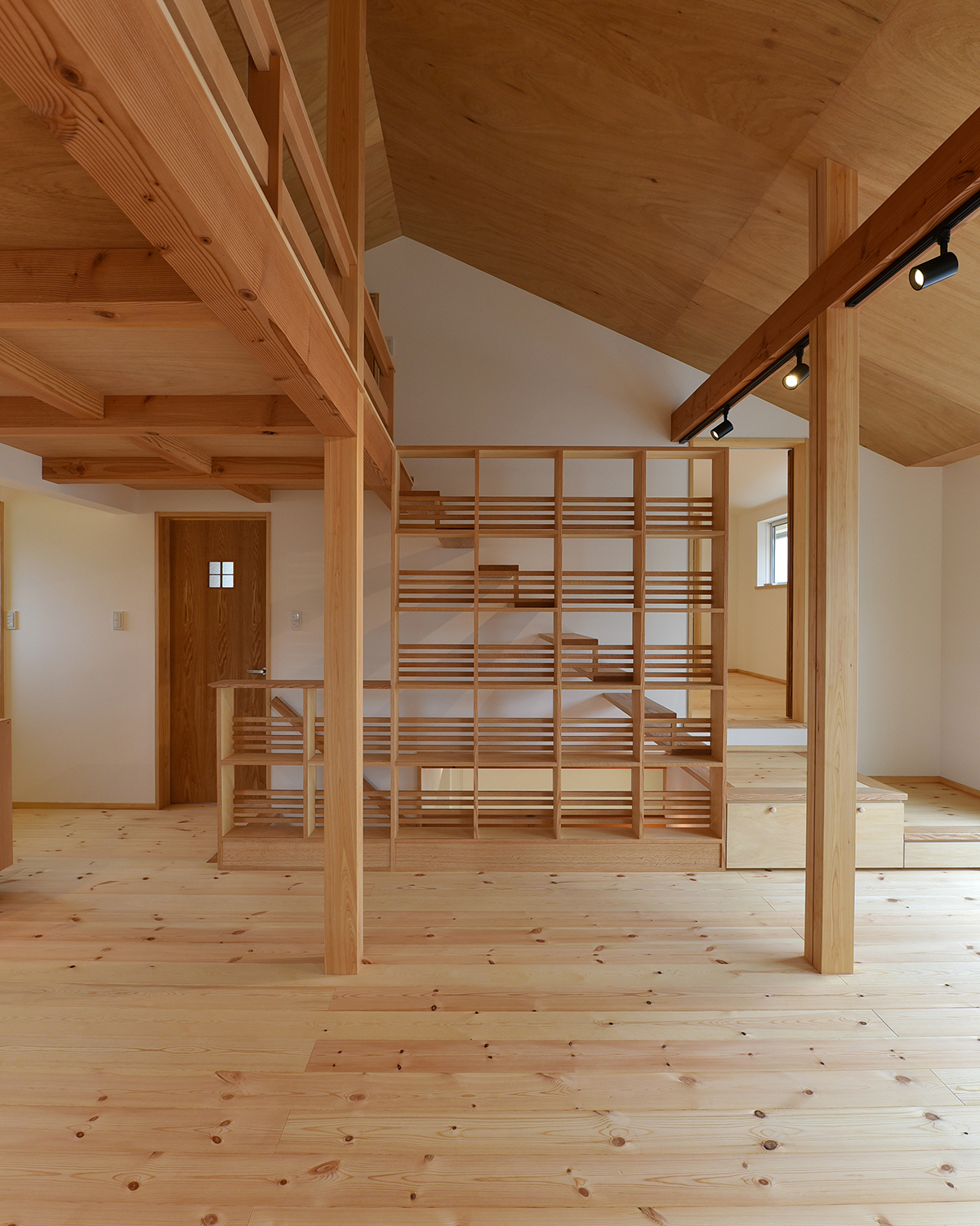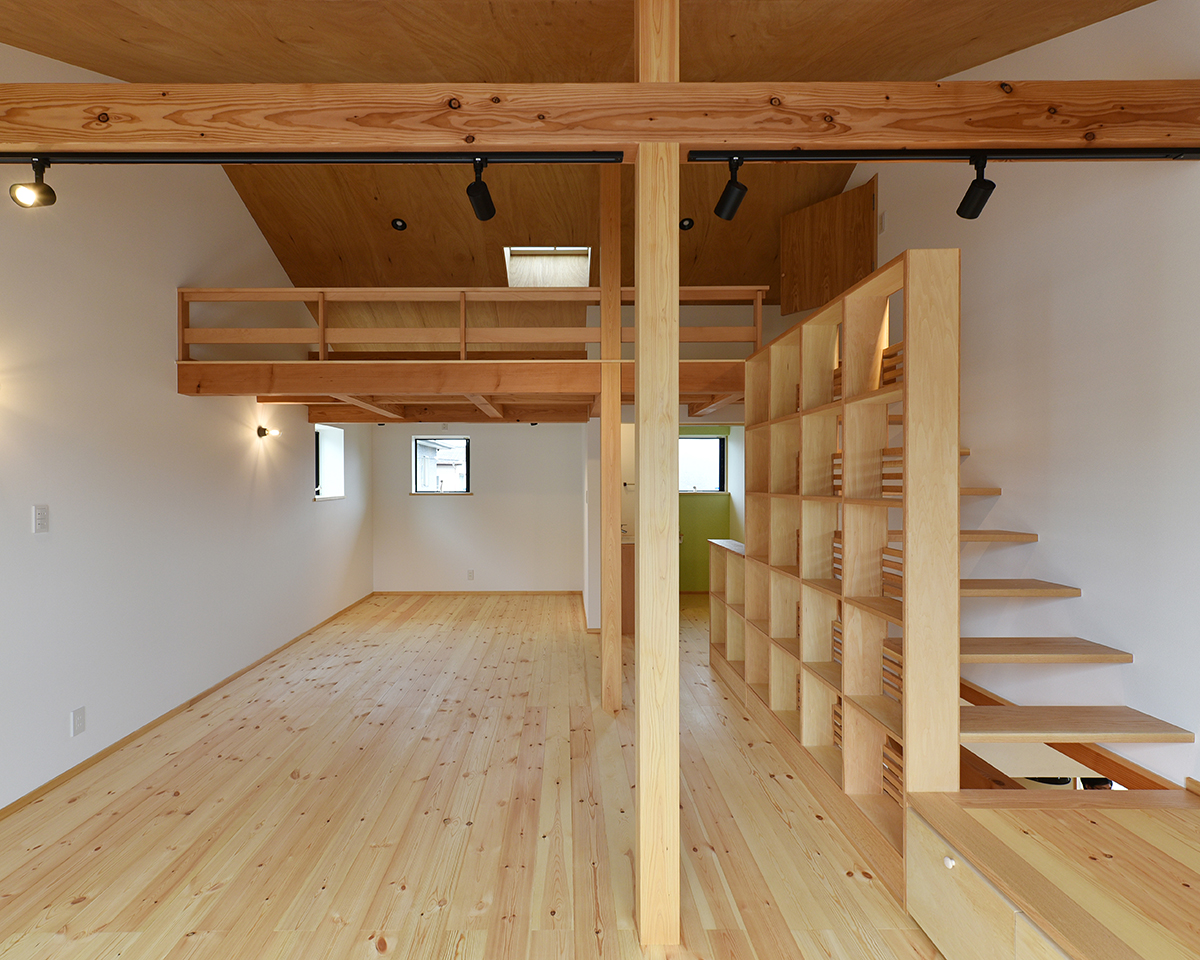 2階フリースペース。将来は子供部屋として仕切る予定。棚はレコードジャケットに合わせて製作。ロフトに上がる階段の下には収納。2階の天井はラワンベニア仕上げ。