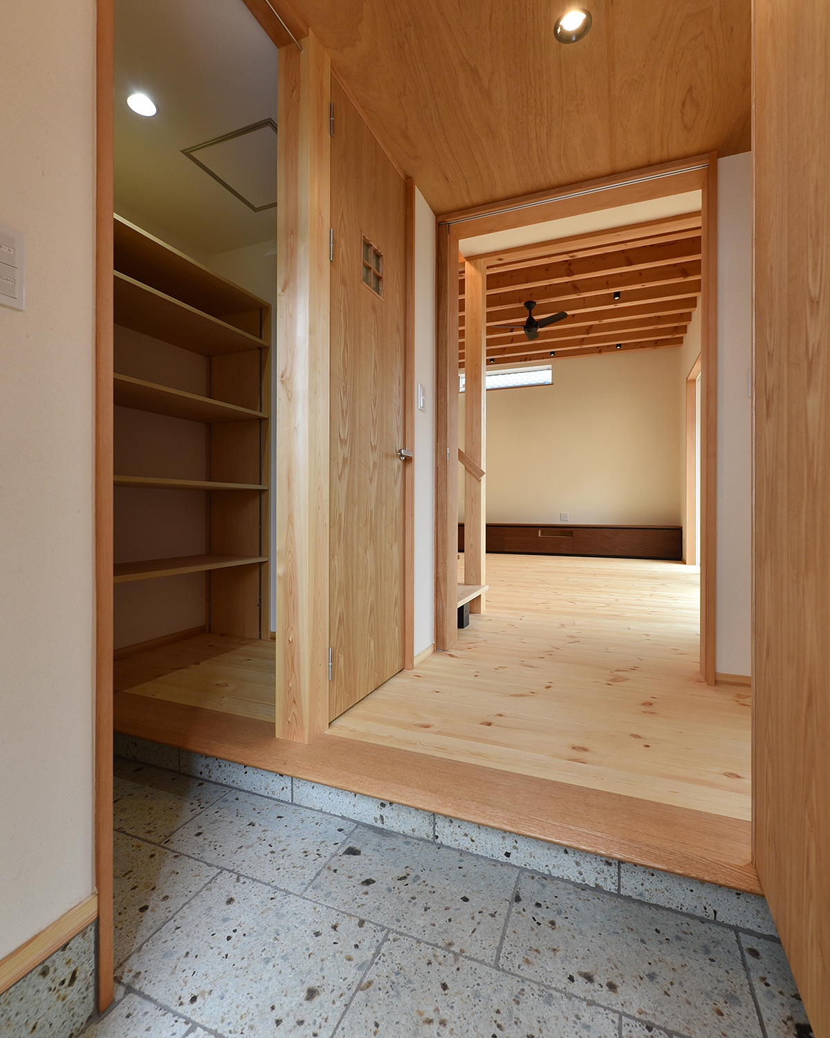ポーチから続く大谷石貼りの玄関。左手はファミリークローク。