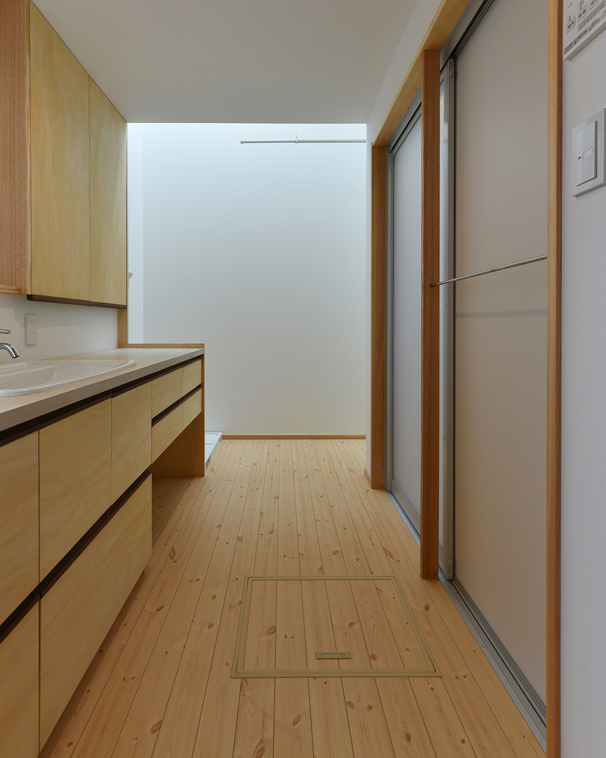 洗面脱衣所の奥には吹き抜けの物干し場。家事楽な嬉しい仕掛けが…