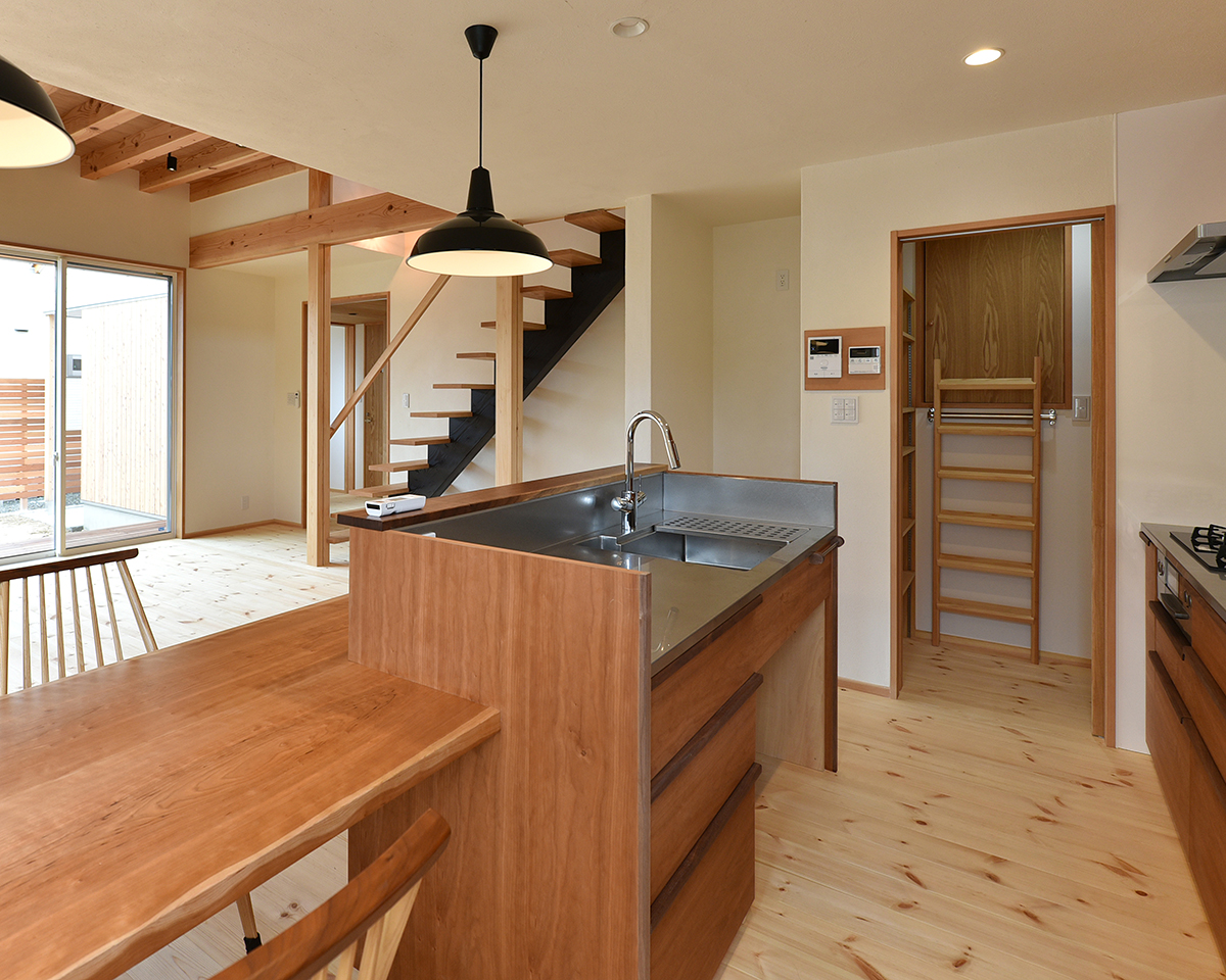 キッチンはシナ、アメリカンチェリー、ナラ、ウォールナットを組み合わせて造付。奥のハシゴと扉は、ガレージ上部を利用した大空間収納。