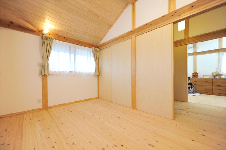 主寝室。2階は勾配天井仕上げで天井高を高くとりリラックスできるように。