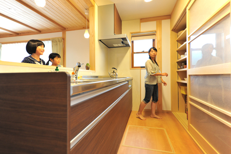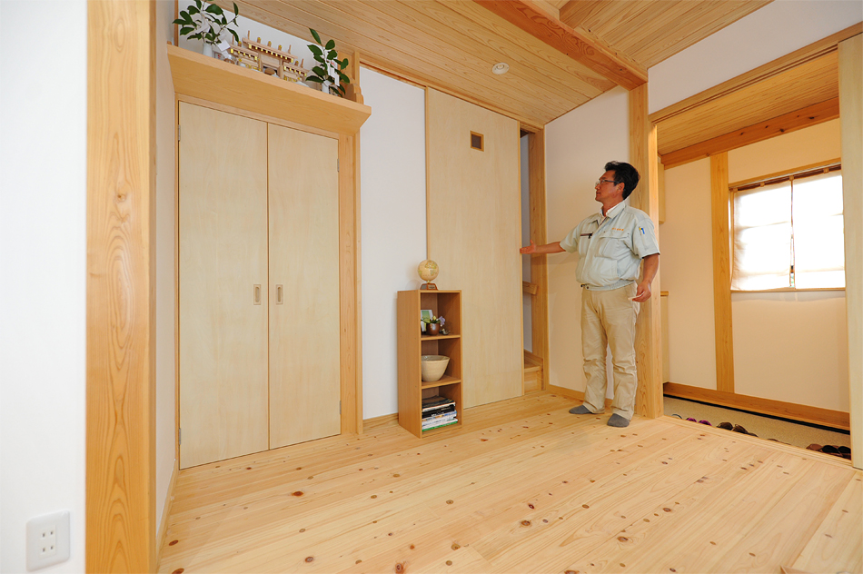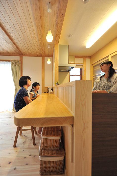 造り付け家具を多用し家具でスペースが埋まらないようにし、家の中の凹凸も最小限にとどめる工夫。さらに漆喰の白と無垢の木の明るさで部屋が広く感じられるようになっています。建築中に神棚の位置やカウンターの高さなど細かな変更にも柔軟に対応出来るのも地元の工務店ならでは。