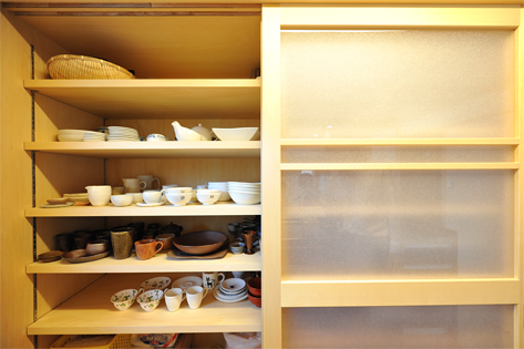 キッチンの背面には陶芸が趣味の奥様の作品がしまえるように作り付けられた食器棚&家電収納があります。