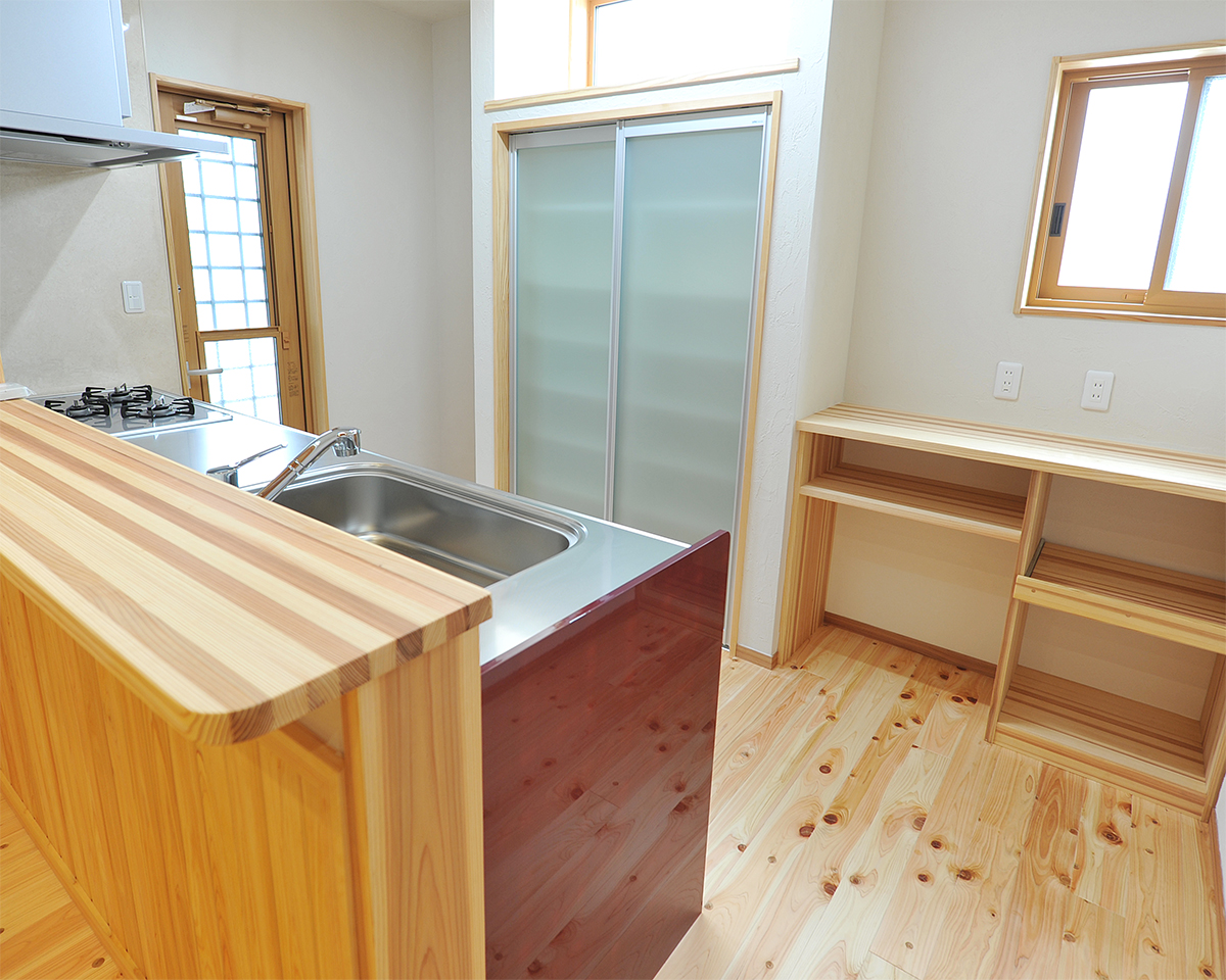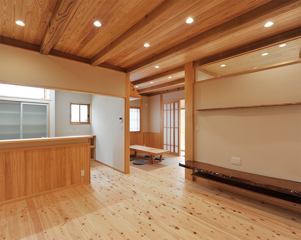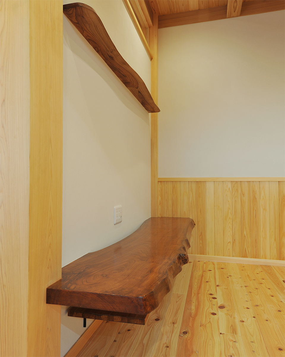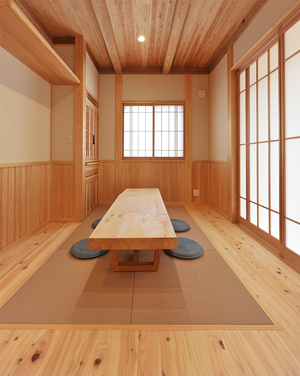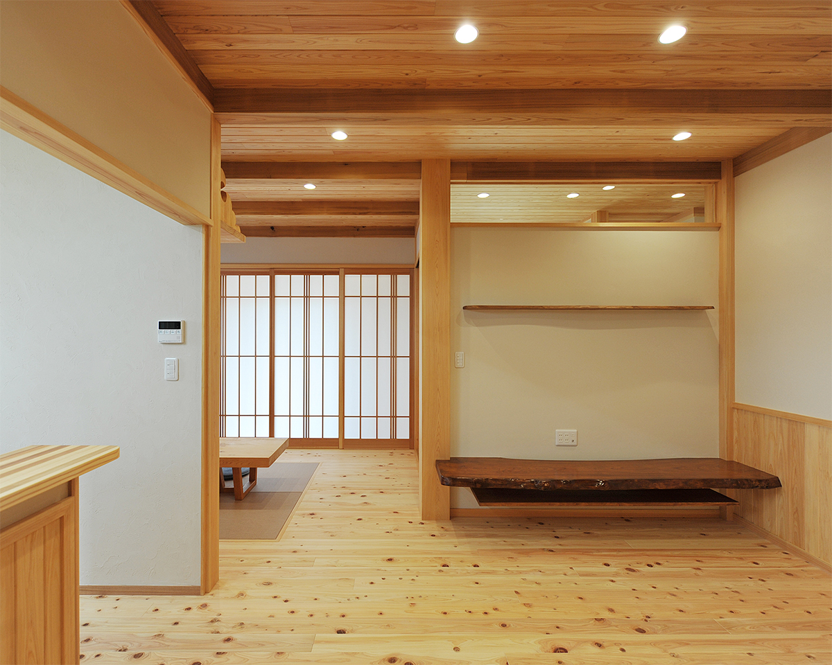 和室を逆サイドより。板敷き部分を多くして、タンスや生活品などを置きやすくするとともに、車椅子が必要になったときにも配慮しています。