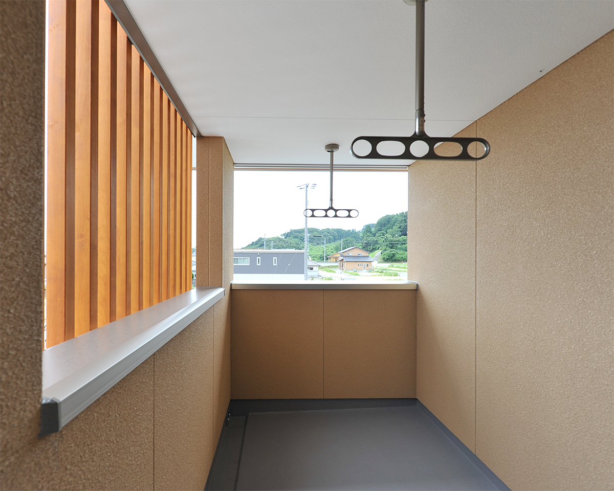 外部の洗濯物干し場は屋根と目隠しが付いて風雨や視線にも配慮。