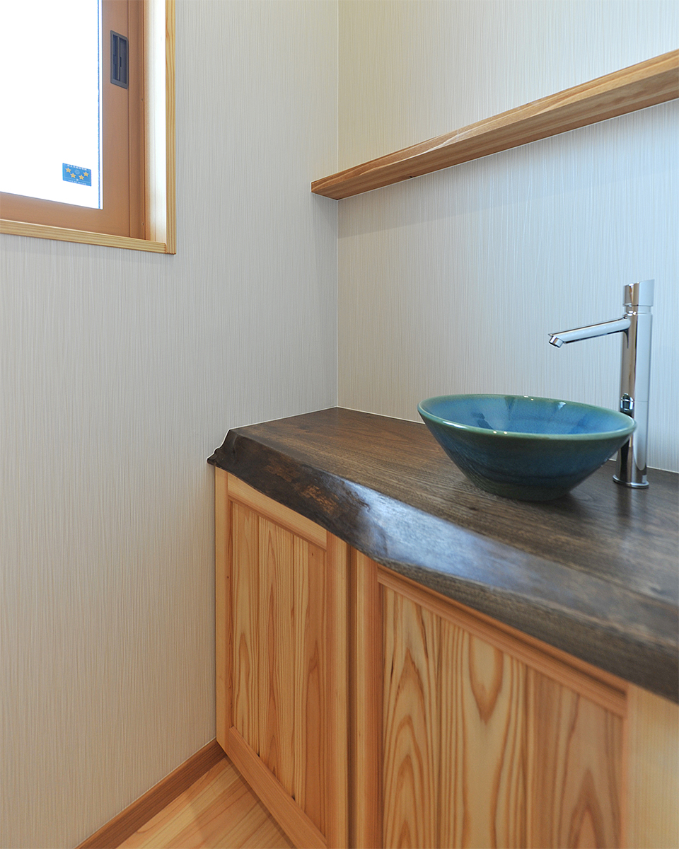 トイレの中に、信楽焼のボールの手洗い。お母様が使いやすいように高さを低めに造作。
