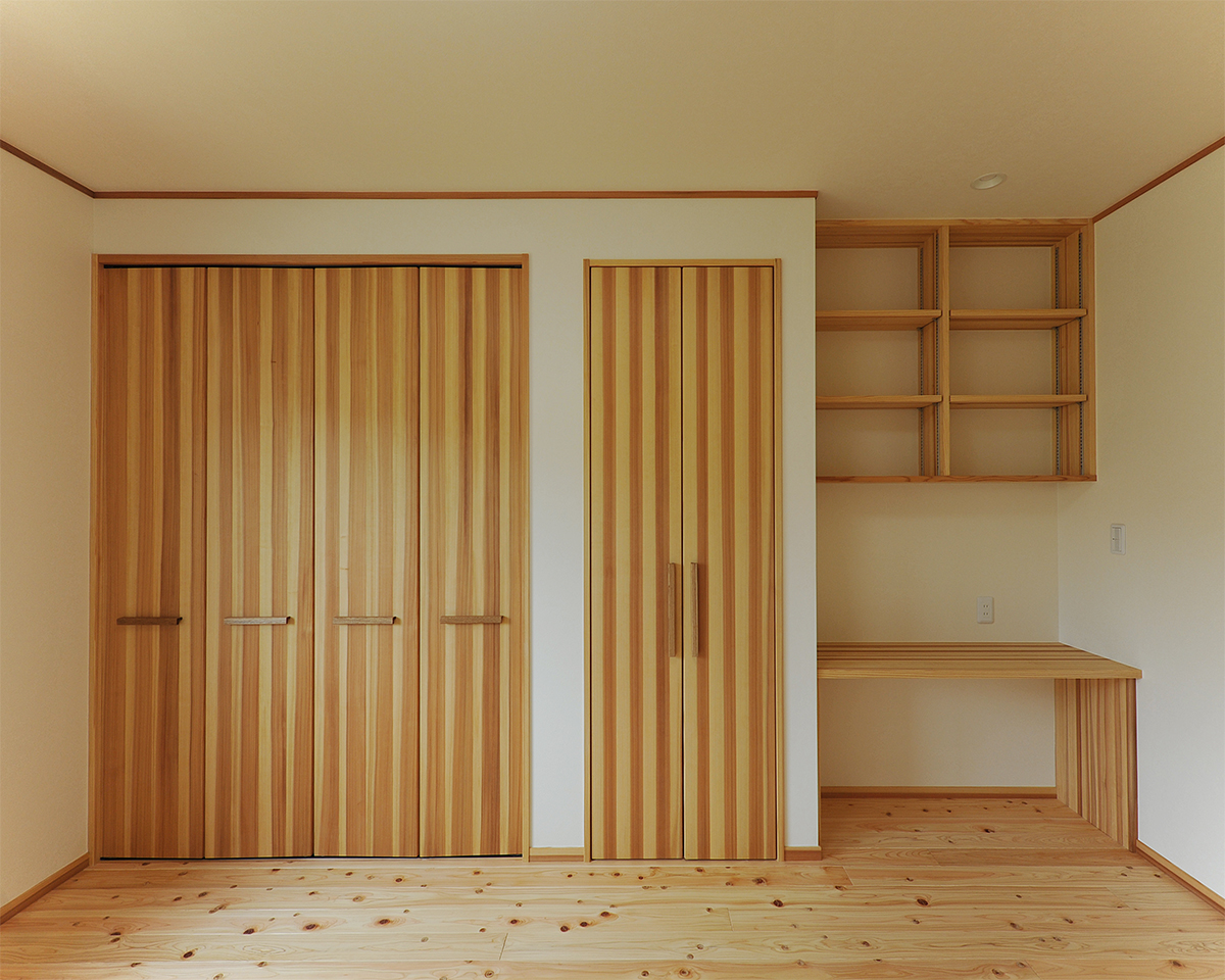 木の香りと質感にあふれている息子さんの洋室。大きめ収納に加えてデスクスペースも設けています。