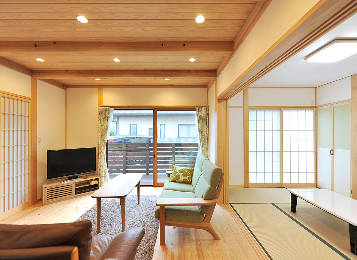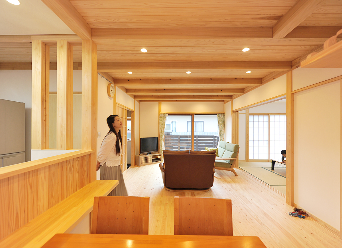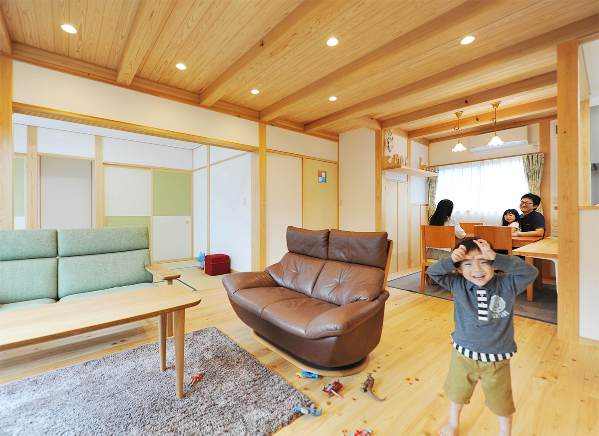LDK+和室は開放的な空間として、家族が一緒にご飯を食べ、テレビを見て、まだ小さい子どもたちを安心して見渡せる間取りになりました。