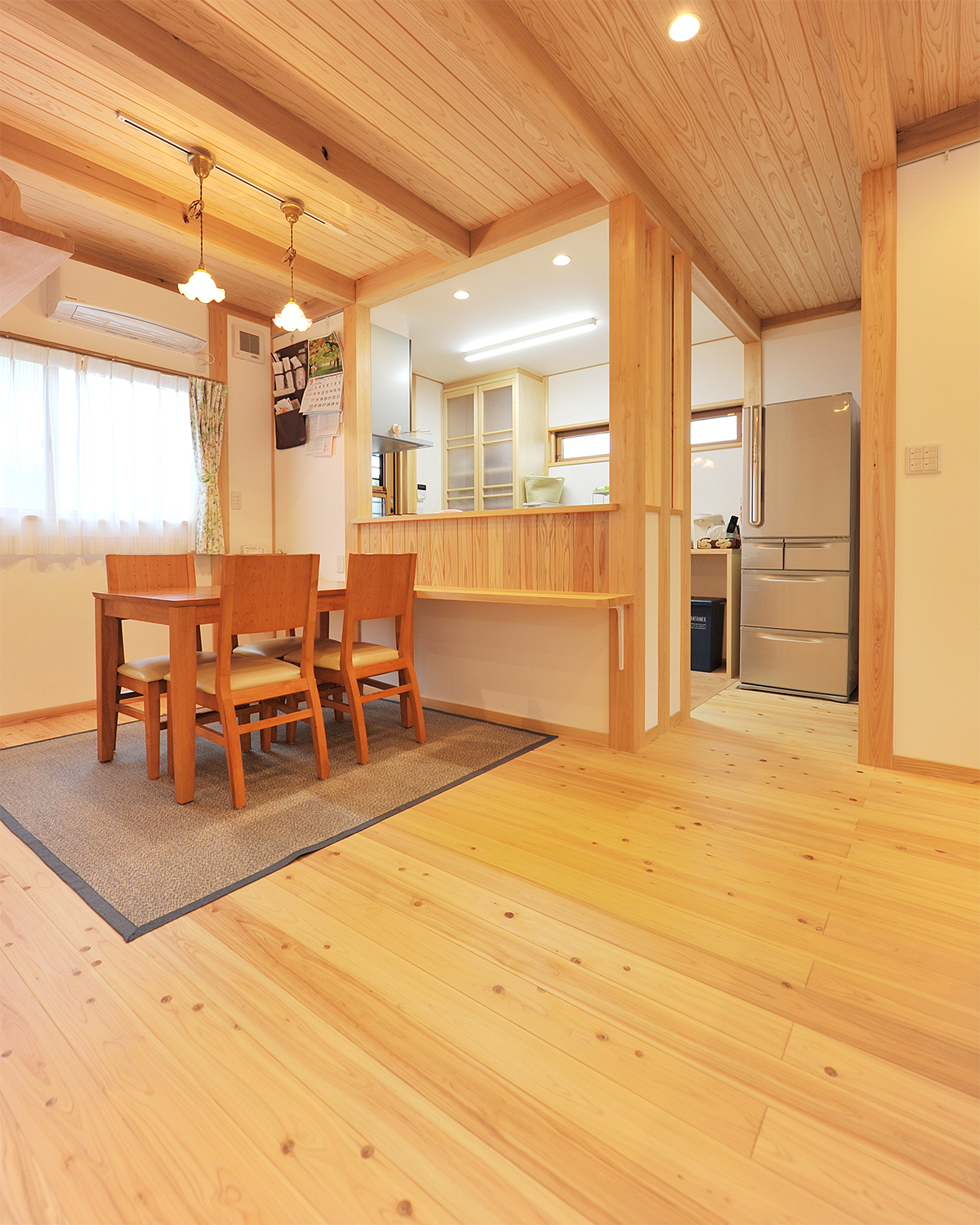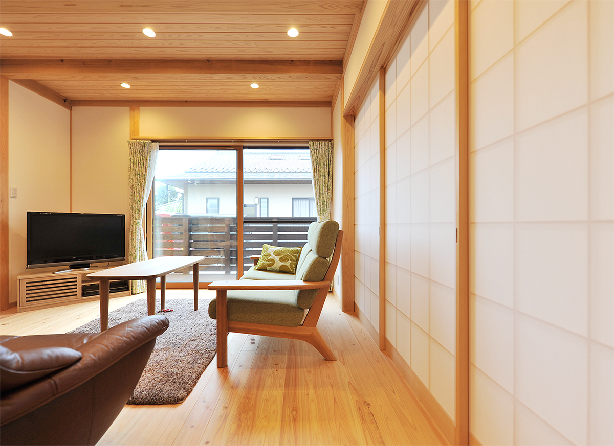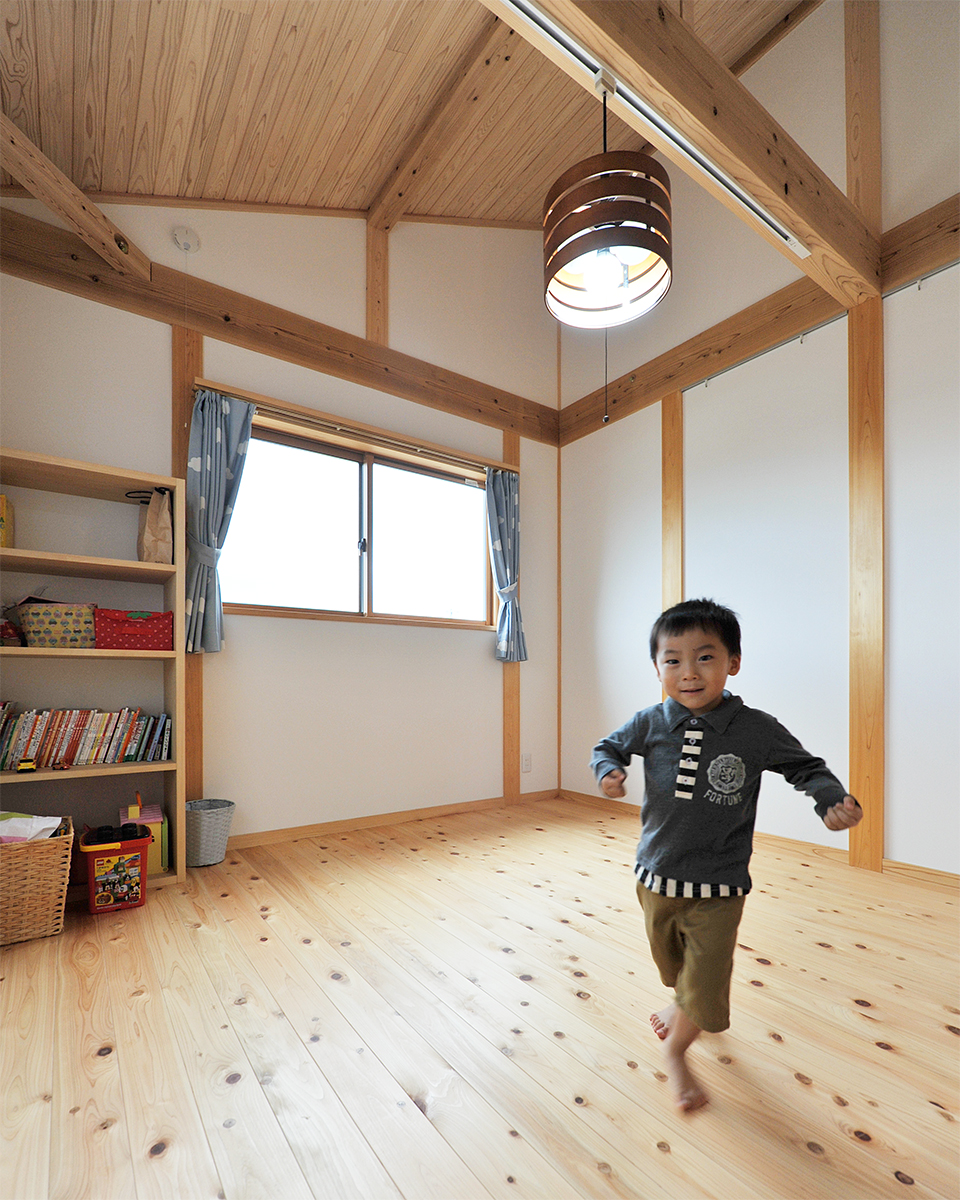 天井は杉梁と杉板、床は桧、壁は漆喰。身体に優しい自然素材に包まれて毎日過ごせます。
