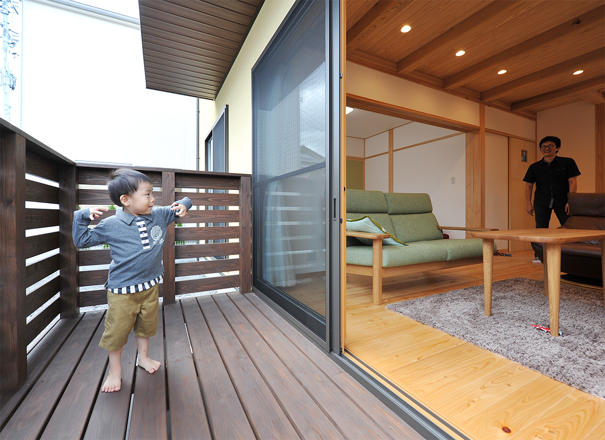 LDKと繋がるデッキは約3畳。さらに広々と子どもたちが遊び回れます。雨の日も遊び場には困りません。