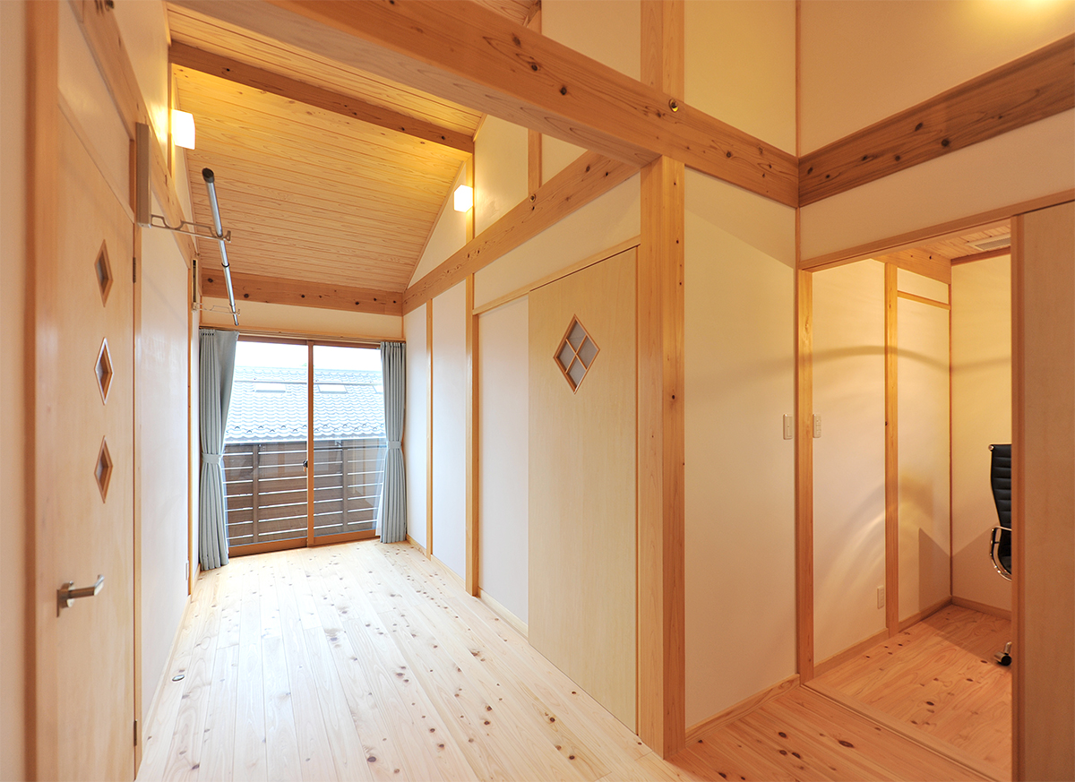 屋根勾配を利用して広々と開放感を出した2階フリースペース。洗濯物も干せます。各居室のドアのデザインを少しづつ変えてアクセントを加えています。