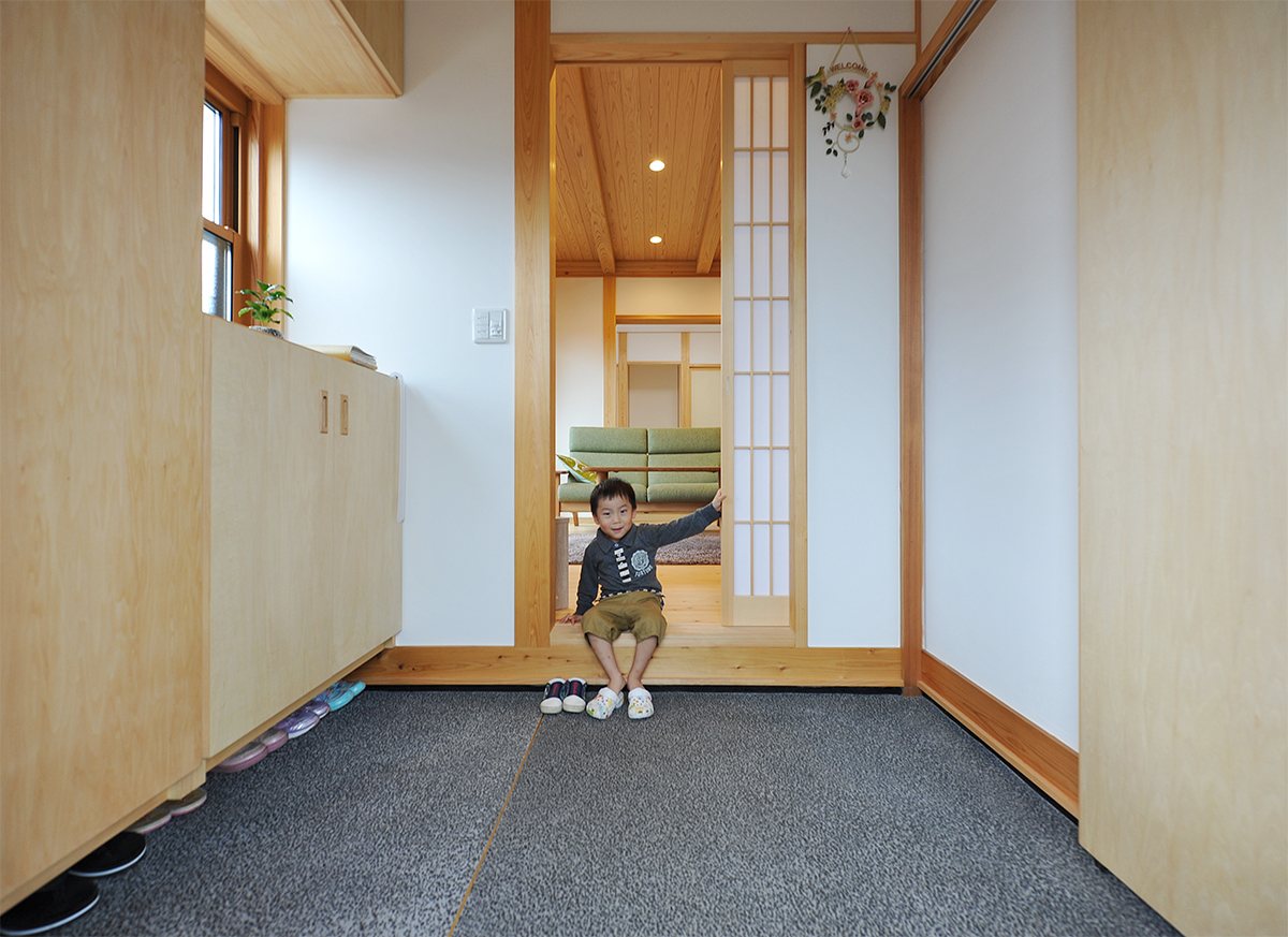 洗い出し仕上げの三和土(たたき)の土間。左側は靴箱、右側は三輪車などもしまえるウォークインクローゼット。