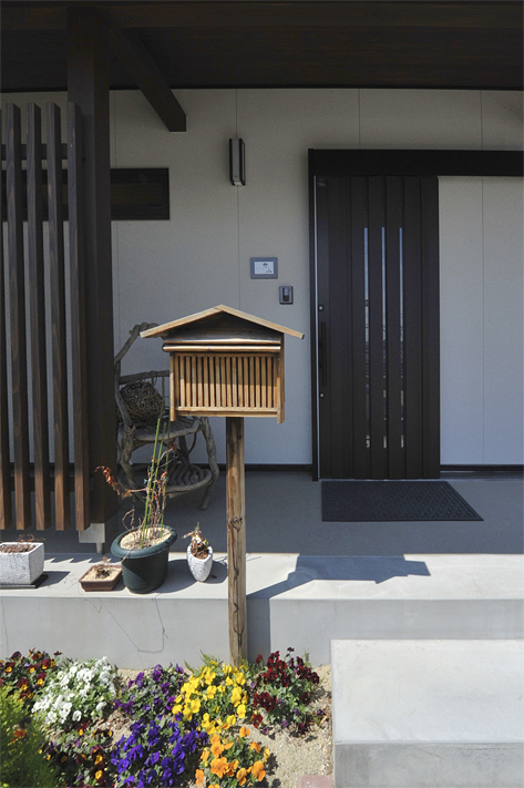 土間玄関にはベンチを設け履物の着脱を容易に(写真左)。 ご主人お手製の郵便受けと奥様のお花が客人をおもてなし(写真右)。