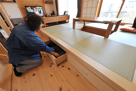 ちょっとした隙間も物入れとして活用(写真左)。 畳ダイニングの下は大容量引き出し収納(写真右)。