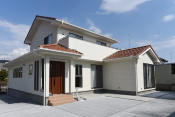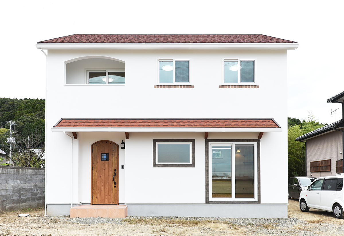 南欧風の可愛らしい外観は、Sto塗り壁であたたかみのある仕上がり。シンプルに仕上げてあるので飽きのこないデザインになっています。