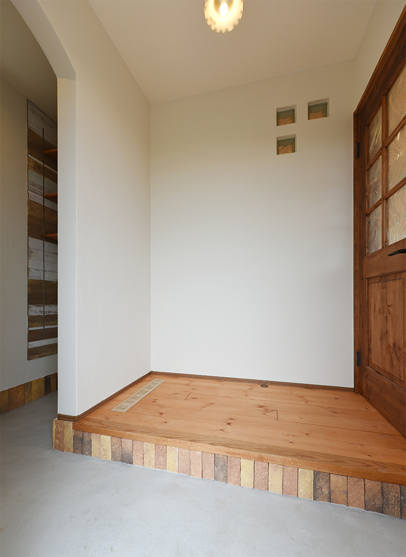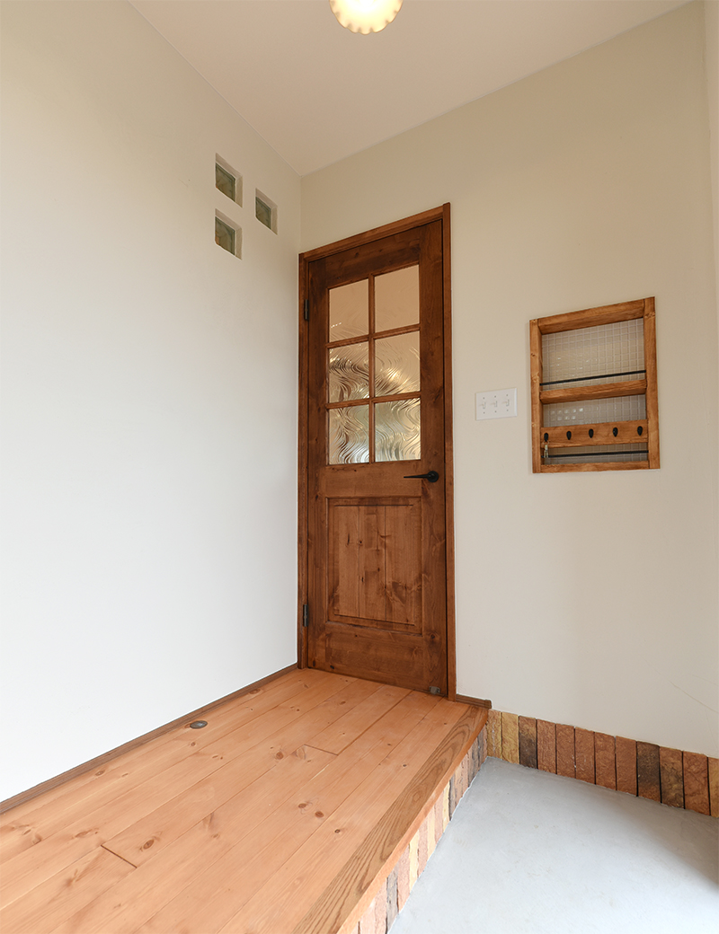 玄関ホールは擬石タイルとブロックガラスをあしらい、鍵など小物を納められるニッチも設置。