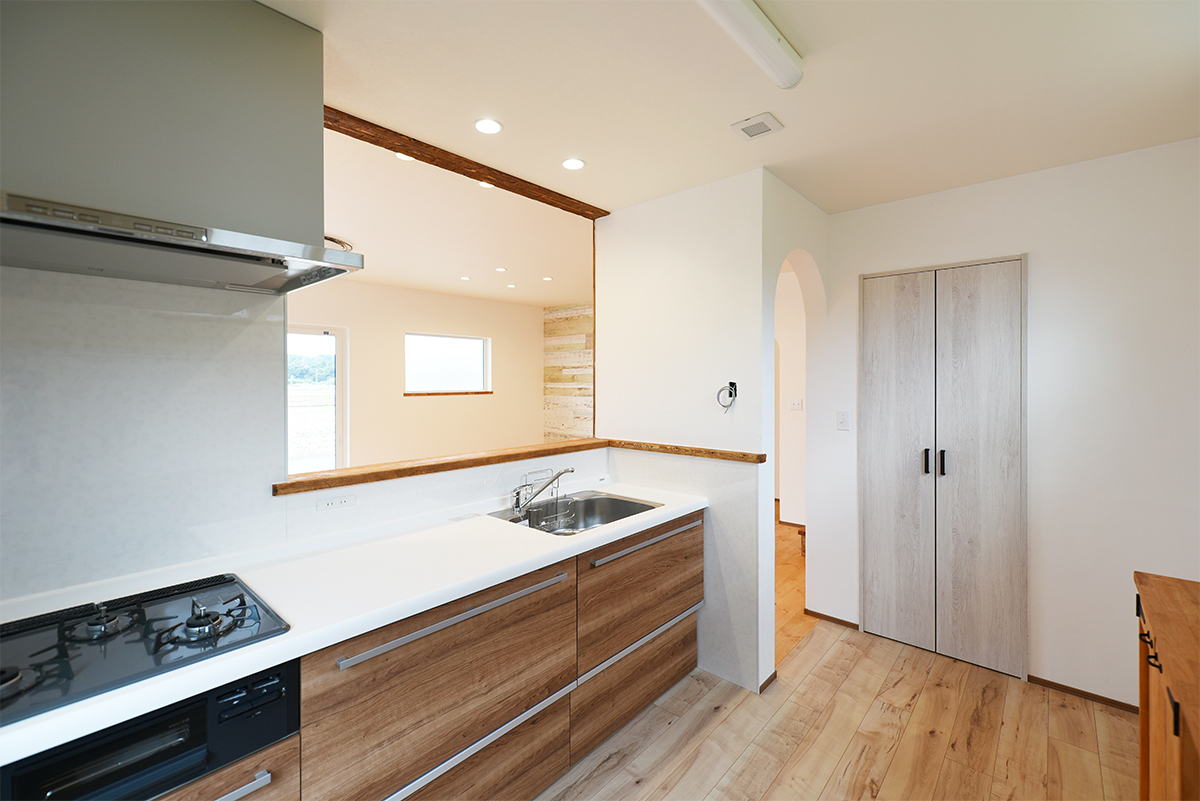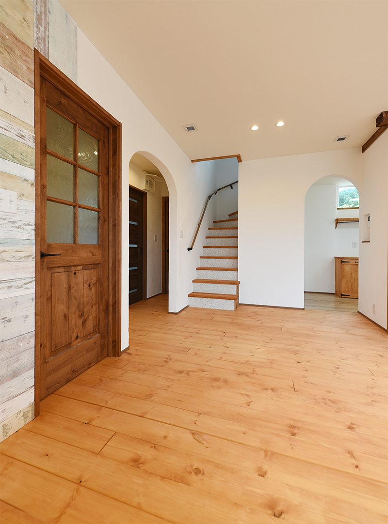 玄関ホールの木製ドアからLDKに入った所。サニタリーとキッチン方向にアールの入り口が2つ。