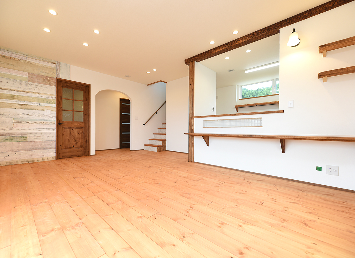1階はワンルーム仕様のLDK。フローリングはパインの無垢材。家中至る所にニッチをしつらえて小物などお気に入りのものを飾れるように。