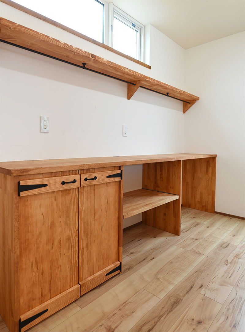 大工工事でキッチン収納も造作。「今回は鉄をアクセントに使ってみました」と鐵専務。
