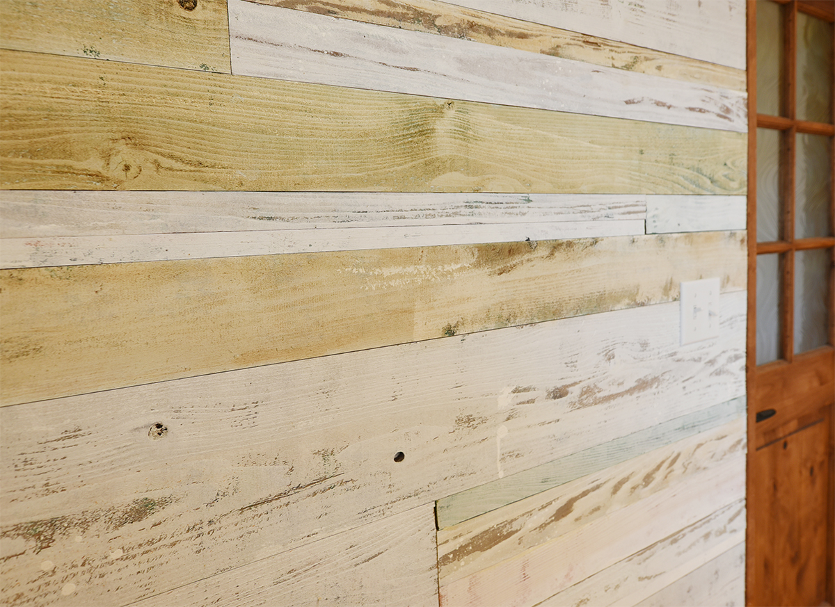 鐵専務が自らアンティーク塗装した壁。シャビーな色使いが冴えます。「下地用の杉野地板を使っているので失敗を恐れず塗れました(笑)」