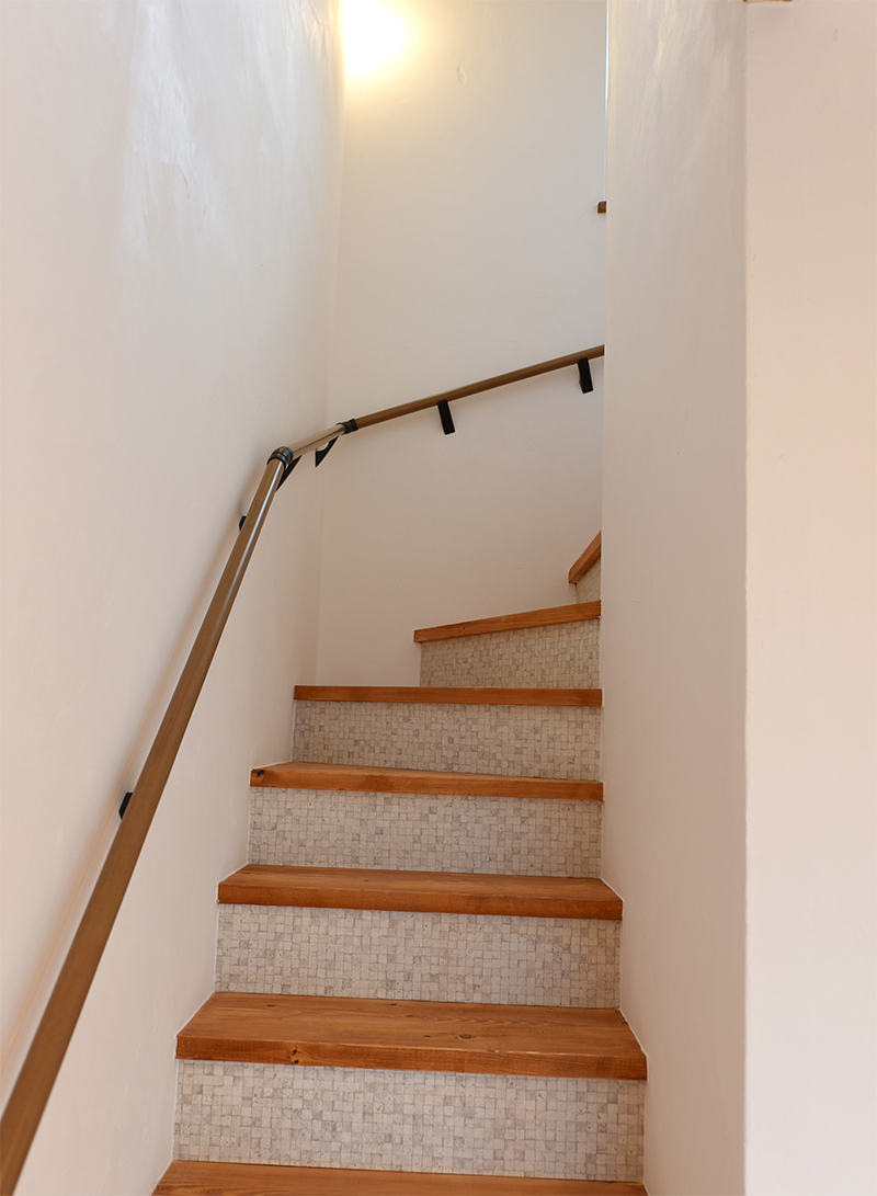カルクウォールの質感が照明に映える階段スペース。1階の壁はプロが施工し、2階からは建主様と一緒に塗り壁施工されています。