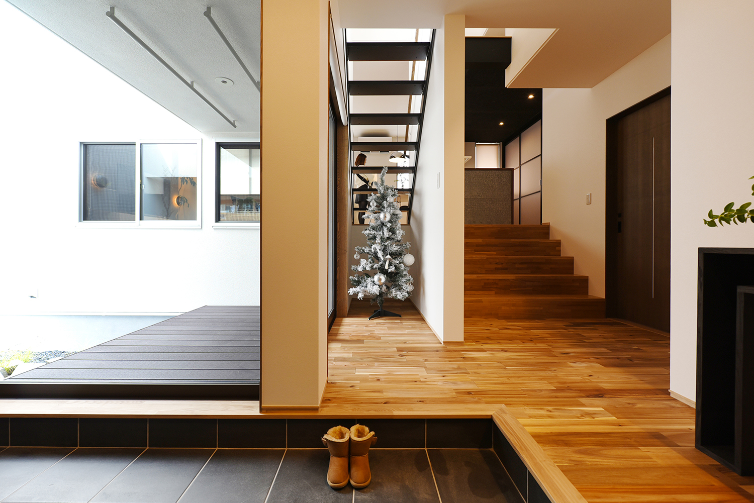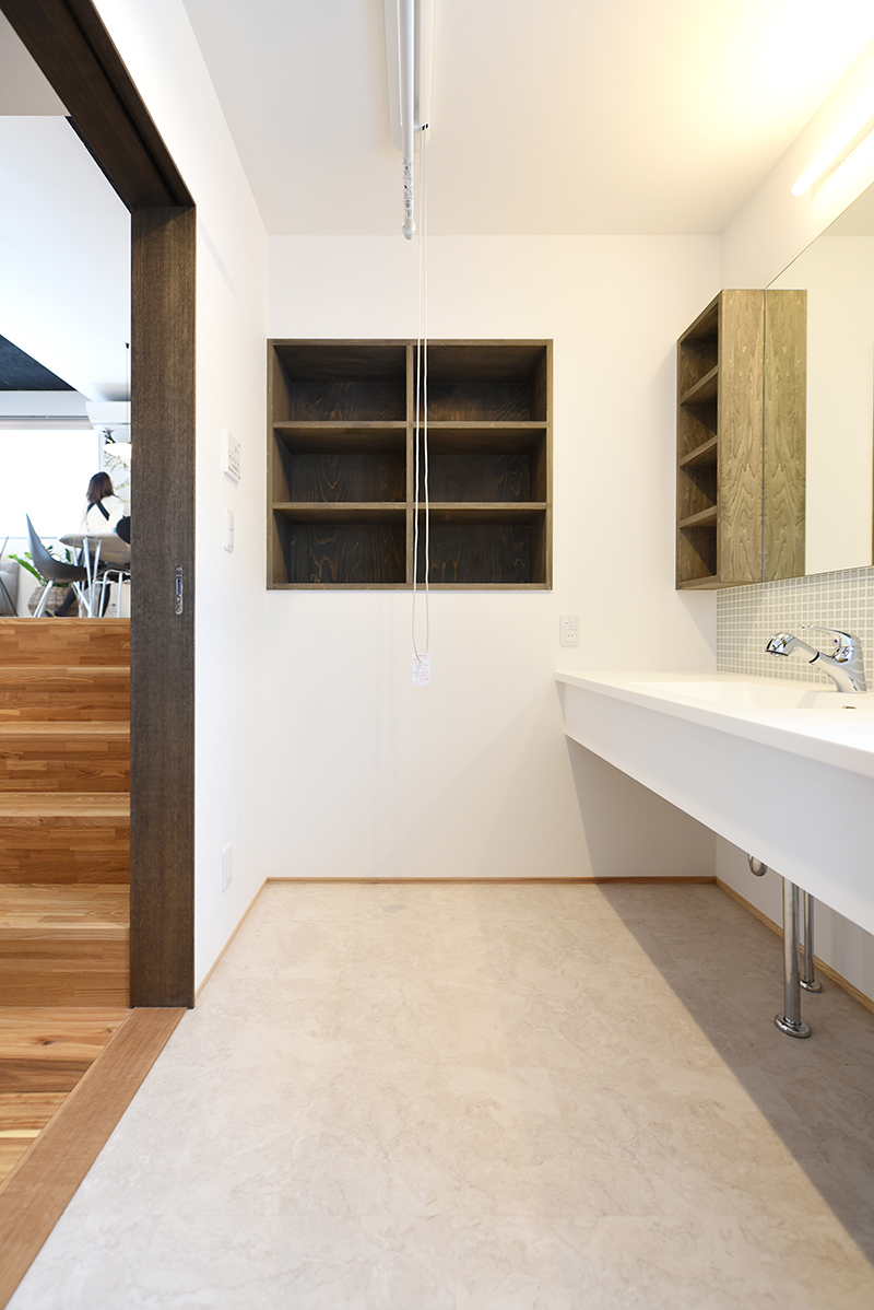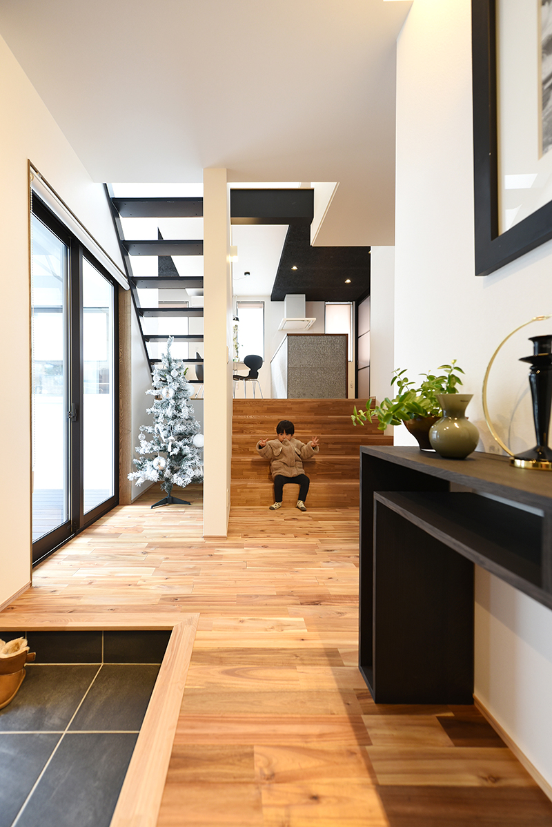 玄関を入るとタイル張りの広い土間と、天井まで高さのある幅3.5mの大容量の収納。玄関収納側からスキップフロアになった室内方面。左より中庭→階段→洗面脱衣、お風呂、トイレなど水周り。