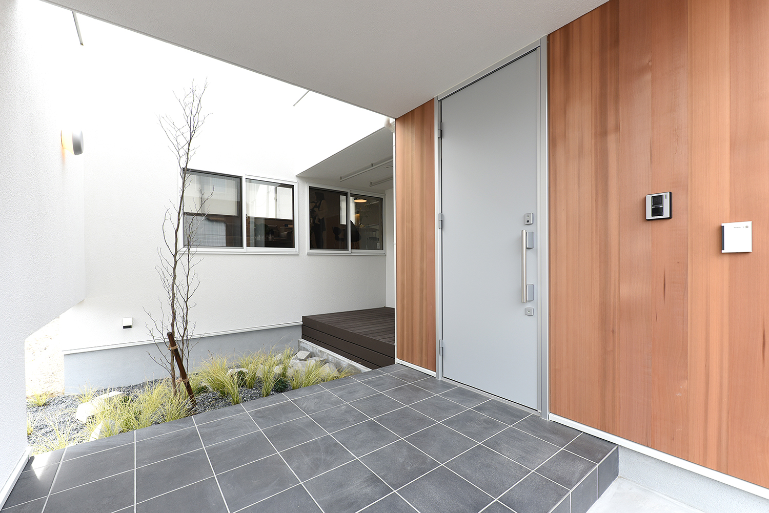 玄関ポーチと中庭。中庭は周囲からの目隠しになりながら、各部屋に光をもたらします。